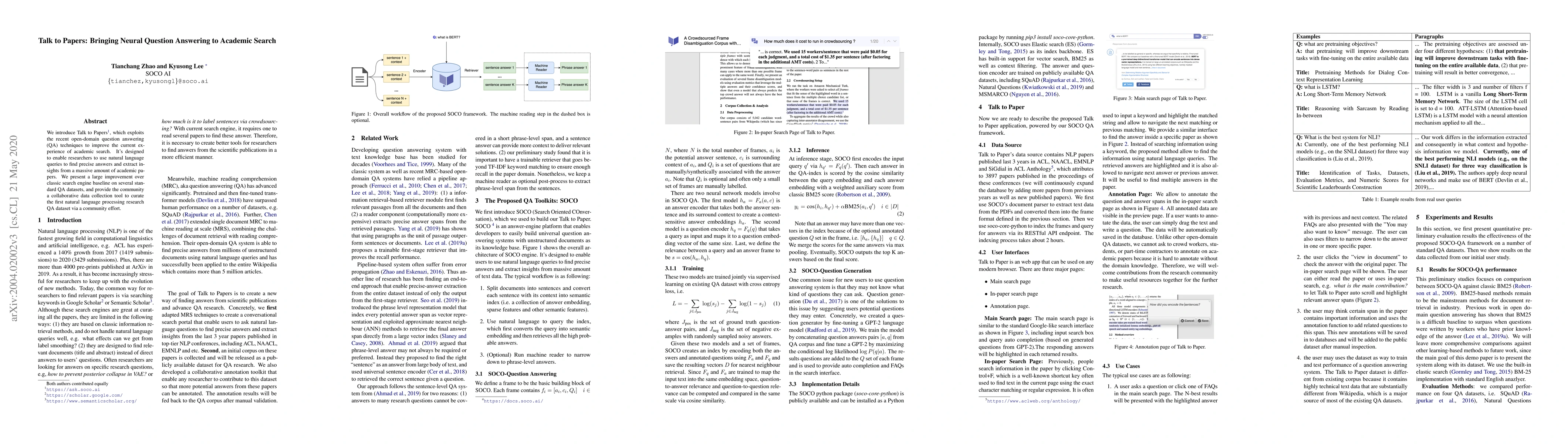 Talk to Papers improves academic search with a natural language query system that extracts precise answers from a large dataset of papers, outperforming classic search engines in several QA datasets.