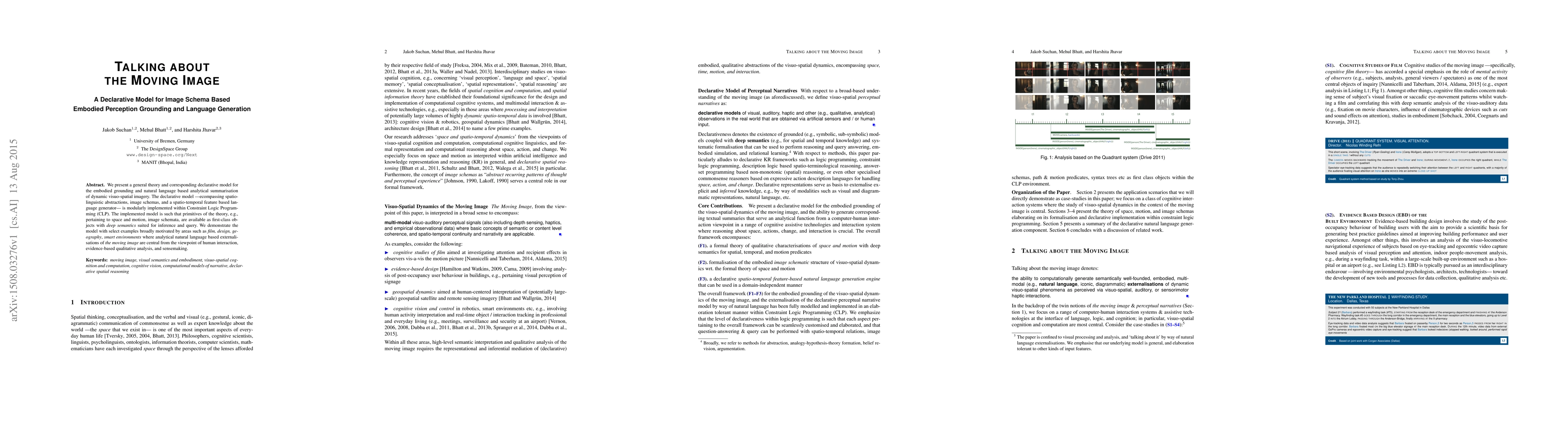 We present a general theory and corresponding declarative model for the embodied grounding and natural language based analytical summarisation of dynamic visuo-spatial imagery. The declarative model ---ecompassing spatio-linguistic abstractions, image schemas, and a spatio-temporal feature based language generator--- is modularly implemented within Constraint Logic Programming (CLP). The implemented model is such that primitives of the theory, e.g., pertaining to space and motion, image schemata, are available as first-class objects with `deep semantics' suited for inference and query. We demonstrate the model with select examples broadly motivated by areas such as film, design, geography, smart environments where analytical natural language based externalisations of the moving image are central from the viewpoint of human interaction, evidence-based qualitative analysis, and sensemaking. Keywords: moving image, visual semantics and embodiment, visuo-spatial cognition and computation, cognitive vision, computational models of narrative, declarative spatial reasoning