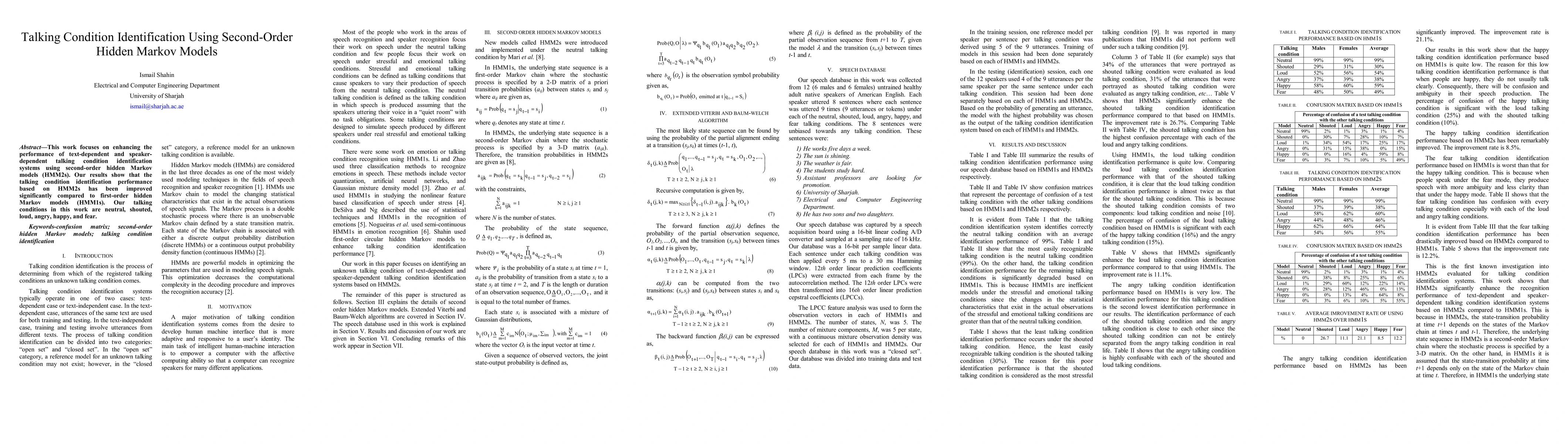 This research improves text-dependent and speaker-dependent talking condition identification using second-order hidden Markov models (HMM2s), achieving better performance than first-order models (HMM1s). The identified conditions include neutral, shouted, loud, angry, happy, and fear.