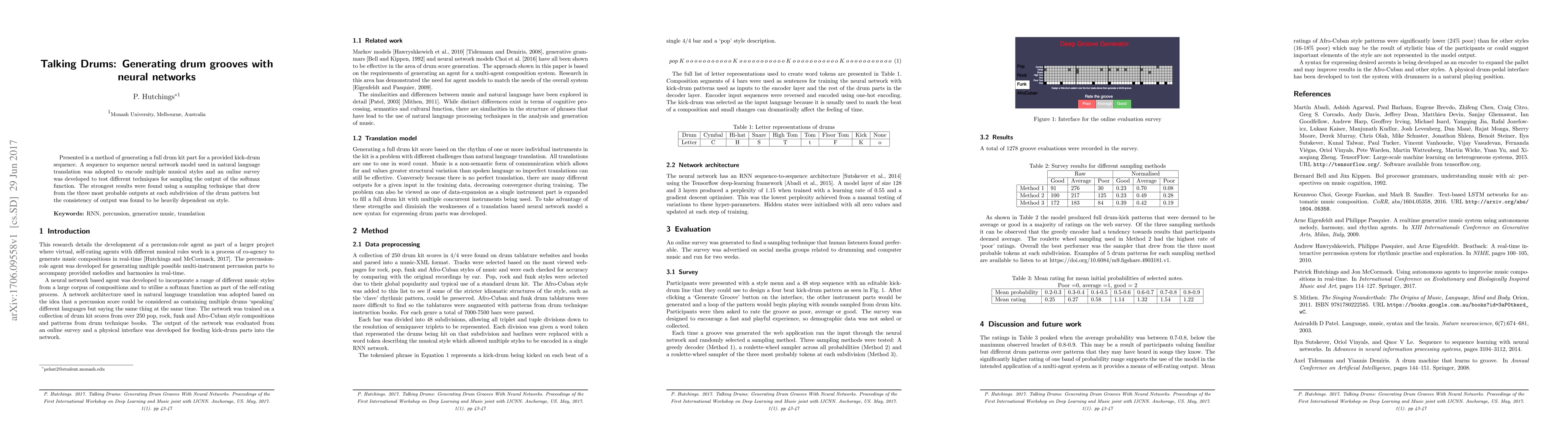 Presented is a method of generating a full drum kit part for a provided kick-drum sequence. A sequence to sequence neural network model used in natural language translation was adopted to encode multiple musical styles and an online survey was developed to test different techniques for sampling the output of the softmax function. The strongest results were found using a sampling technique that drew from the three most probable outputs at each subdivision of the drum pattern but the consistency of output was found to be heavily dependent on style.