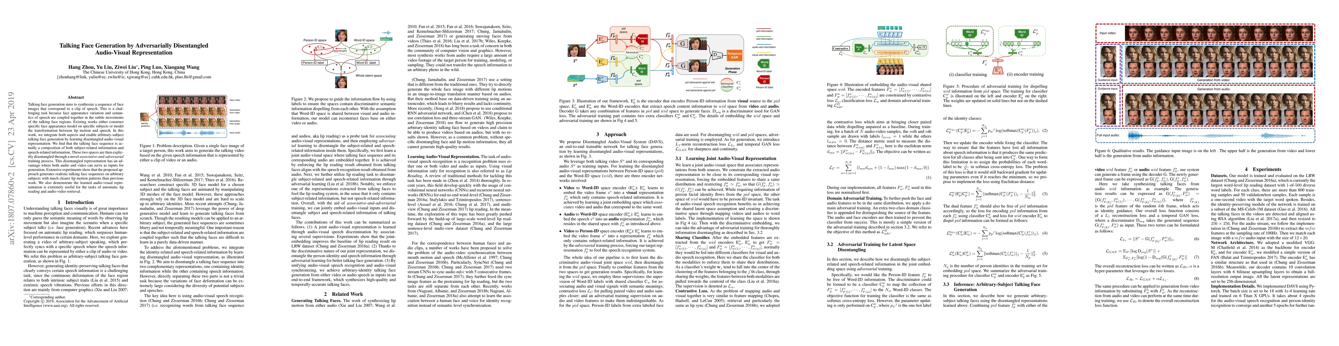 Talking face generation aims to synthesize a sequence of face images that correspond to a clip of speech. This is a challenging task because face appearance variation and semantics of speech are coupled together in the subtle movements of the talking face regions. Existing works either construct specific face appearance model on specific subjects or model the transformation between lip motion and speech. In this work, we integrate both aspects and enable arbitrary-subject talking face generation by learning disentangled audio-visual representation. We find that the talking face sequence is actually a composition of both subject-related information and speech-related information. These two spaces are then explicitly disentangled through a novel associative-and-adversarial training process. This disentangled representation has an advantage where both audio and video can serve as inputs for generation. Extensive experiments show that the proposed approach generates realistic talking face sequences on arbitrary subjects with much clearer lip motion patterns than previous work. We also demonstrate the learned audio-visual representation is extremely useful for the tasks of automatic lip reading and audio-video retrieval.