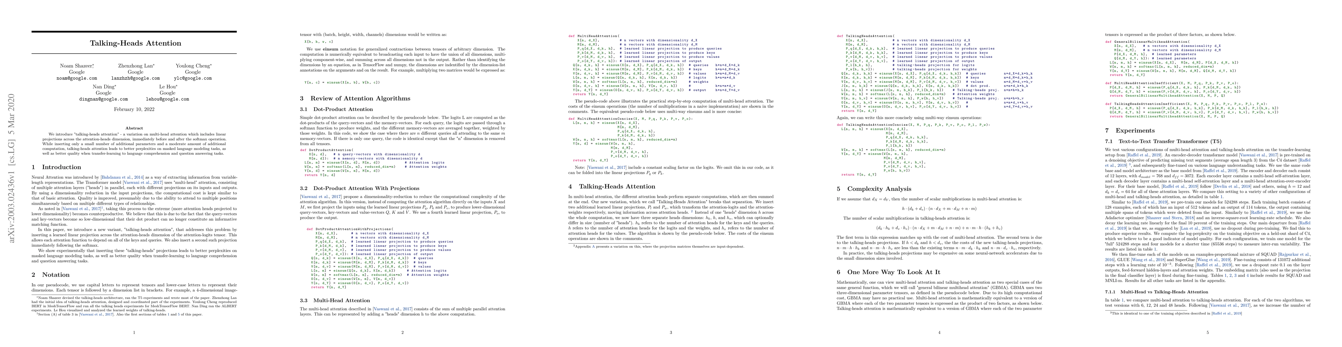 We introduce "talking-heads attention" - a variation on multi-head attention which includes linearprojections across the attention-heads dimension, immediately before and after the softmax operation.While inserting only a small number of additional parameters and a moderate amount of additionalcomputation, talking-heads attention leads to better perplexities on masked language modeling tasks, aswell as better quality when transfer-learning to language comprehension and question answering tasks.