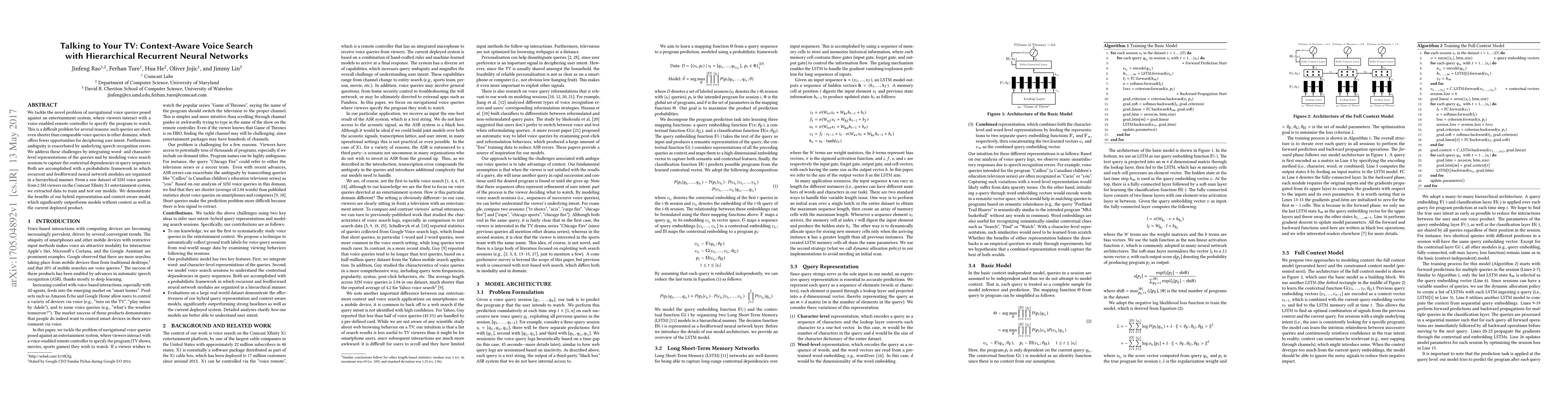 This paper proposes a context-aware voice search system for TV navigation using hierarchical recurrent neural networks, addressing short and ambiguous queries by integrating word- and character-level representations and modeling contextual dependencies. The approach significantly outperforms existing models and the current deployed product on a dataset of 32M queries from 2.5M viewers.