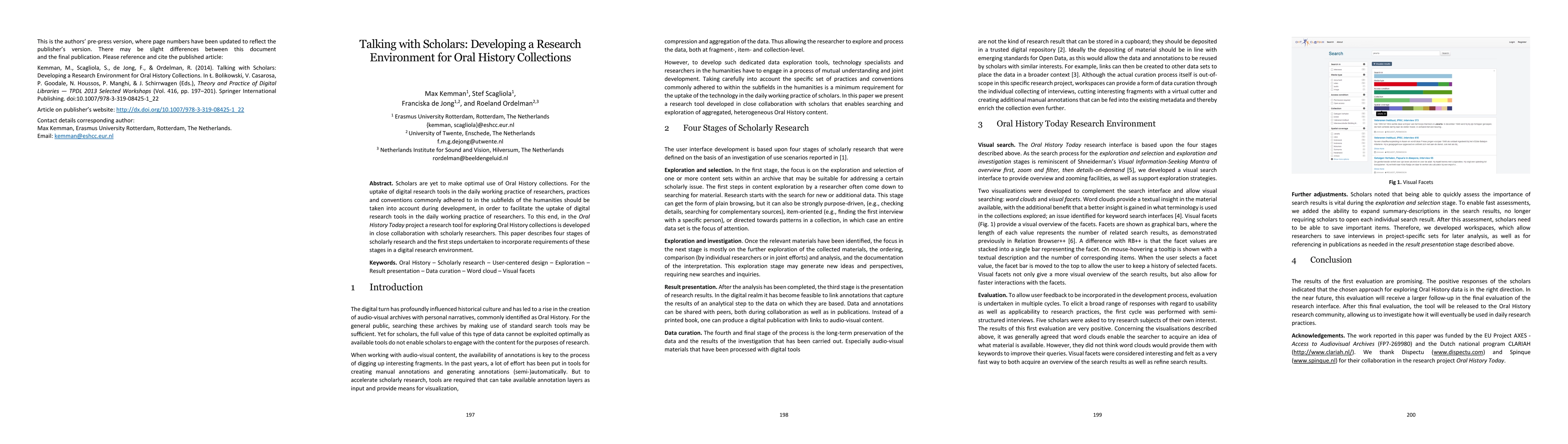This paper explores the development of a digital research tool for Oral History collections, emphasizing collaboration with humanities scholars to integrate their practices. It outlines four stages of scholarly research and initial steps to incorporate these into the new digital environment.