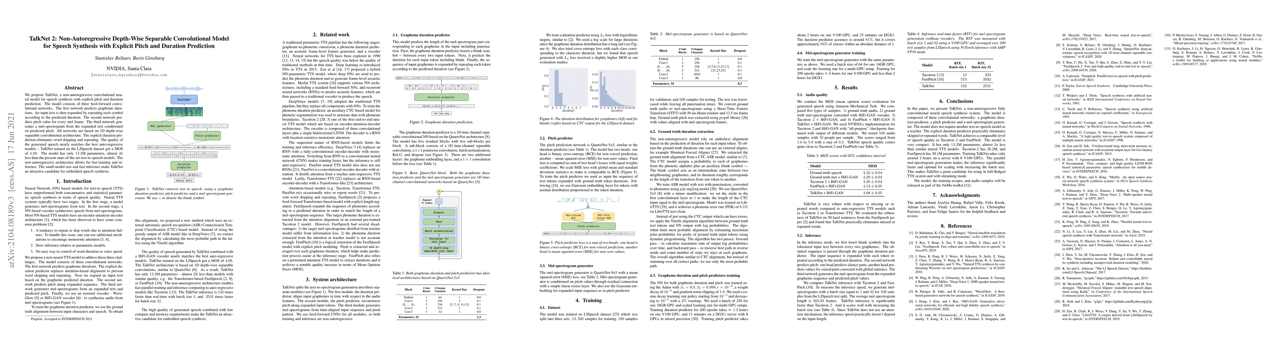TalkNet 2 introduces a non-autoregressive convolutional model for speech synthesis that includes explicit pitch and duration predictions, achieving high-quality speech with fast training and inference, and significantly fewer parameters compared to existing models. The model's architecture and efficient design make it suitable for embedded speech synthesis applications.