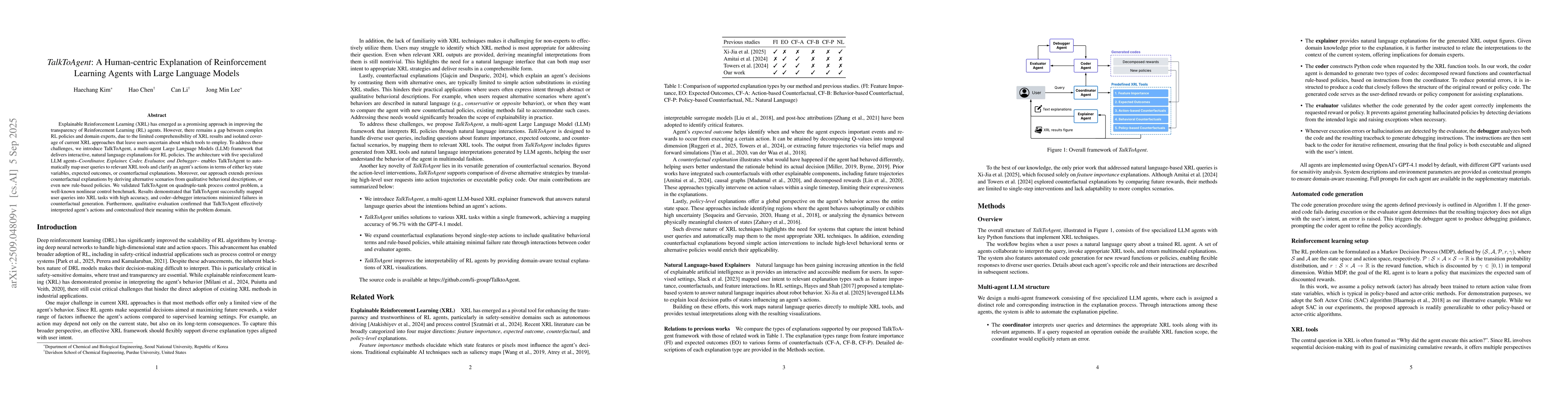Explainable Reinforcement Learning (XRL) has emerged as a promising approach in improving the transparency of Reinforcement Learning (RL) agents. However, there remains a gap between complex RL policies and domain experts, due to the limited comprehensibility of XRL results and isolated coverage of current XRL approaches that leave users uncertain about which tools to employ. To address these challenges, we introduce TalkToAgent, a multi-agent Large Language Models (LLM) framework that delivers interactive, natural language explanations for RL policies. The architecture with five specialized LLM agents (Coordinator, Explainer, Coder, Evaluator, and Debugger) enables TalkToAgent to automatically map user queries to relevant XRL tools and clarify an agent's actions in terms of either key state variables, expected outcomes, or counterfactual explanations. Moreover, our approach extends previous counterfactual explanations by deriving alternative scenarios from qualitative behavioral descriptions, or even new rule-based policies. We validated TalkToAgent on quadruple-tank process control problem, a well-known nonlinear control benchmark. Results demonstrated that TalkToAgent successfully mapped user queries into XRL tasks with high accuracy, and coder-debugger interactions minimized failures in counterfactual generation. Furthermore, qualitative evaluation confirmed that TalkToAgent effectively interpreted agent's actions and contextualized their meaning within the problem domain.