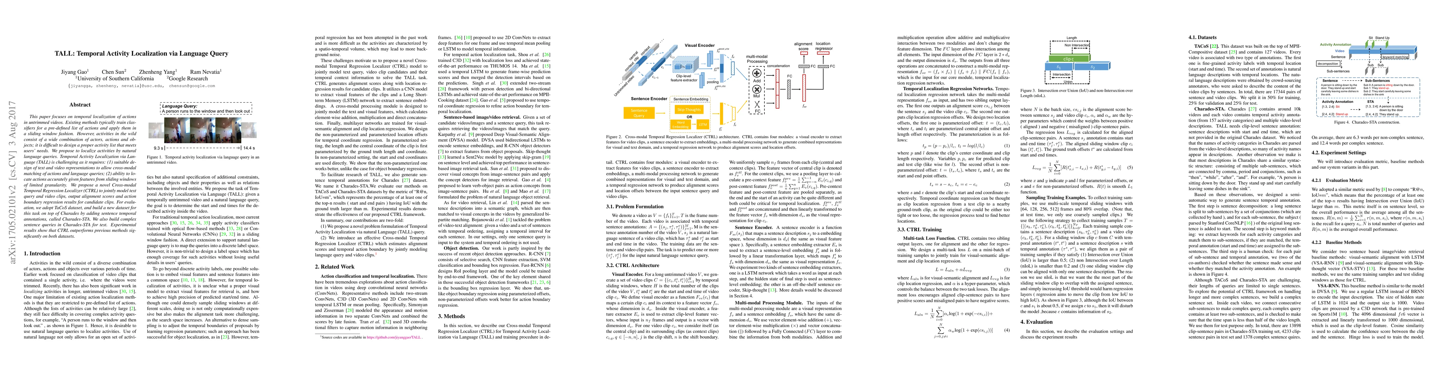 This paper introduces TALL, a method for temporal activity localization in untrimmed videos via natural language queries, addressing the limitations of predefined action lists. It employs a Cross-modal Temporal Regression Localizer (CTRL) to match text and video representations, achieving superior performance on the TaCoS and Charades-STA datasets.