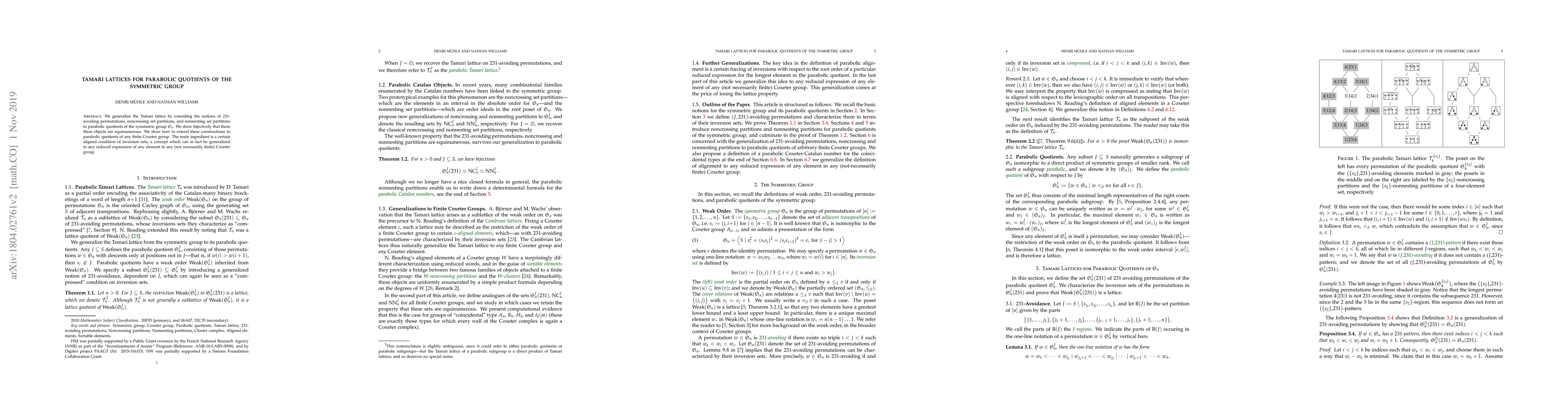 We generalize the Tamari lattice by extending the notions of $231$-avoiding permutations, noncrossing set partitions, and nonnesting set partitions to parabolic quotients of the symmetric group $\mathfrak{S}_{n}$. We show bijectively that these three objects are equinumerous. We show how to extend these constructions to parabolic quotients of any finite Coxeter group. The main ingredient is a certain aligned condition of inversion sets; a concept which can in fact be generalized to any reduced expression of any element in any (not necessarily finite) Coxeter group.