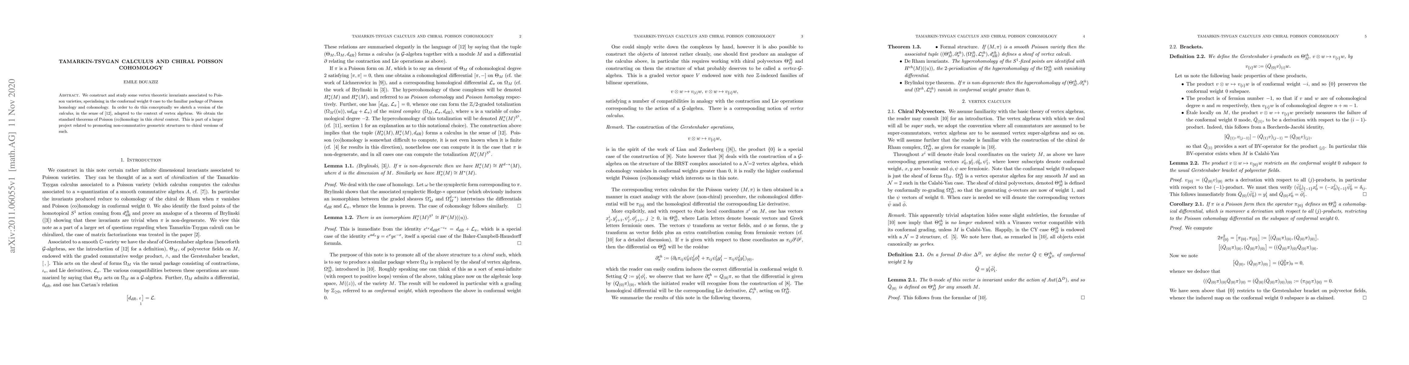This paper introduces vertex algebra-based invariants for Poisson varieties, focusing on conformal weight 0 cases to establish Poisson (co)homology. It outlines a chiral version of Tamarkin-Tsygan calculus, aiming to elevate non-commutative geometric structures to chiral forms.