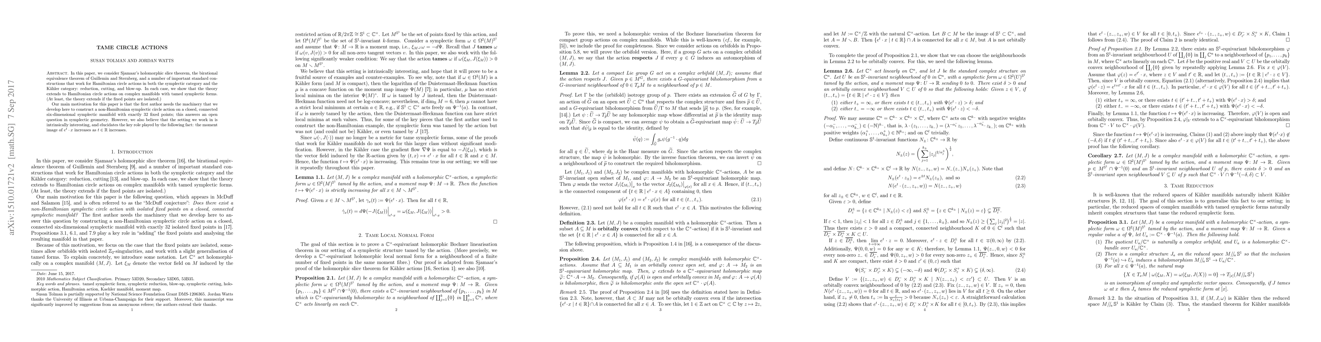 In this paper, we consider Sjamaar's holomorphic slice theorem, the birational equivalence theorem of Guillemin and Sternberg, and a number of important standard constructions that work for Hamiltonian circle actions in both the symplectic category and the K\"ahler category: reduction, cutting, and blow-up. In each case, we show that the theory extends to Hamiltonian circle actions on complex manifolds with tamed symplectic forms. (At least, the theory extends if the fixed points are isolated.) Our main motivation for this paper is that the first author needs the machinery that we develop here to construct a non-Hamiltonian symplectic circle action on a closed, connected six-dimensional symplectic manifold with exactly 32 fixed points; this answers an open question in symplectic geometry. However, we also believe that the setting we work in is intrinsically interesting, and elucidates the key role played by the following fact: the moment image of $e^t \cdot x$ increases as $t \in \mathbb{R}$ increases.