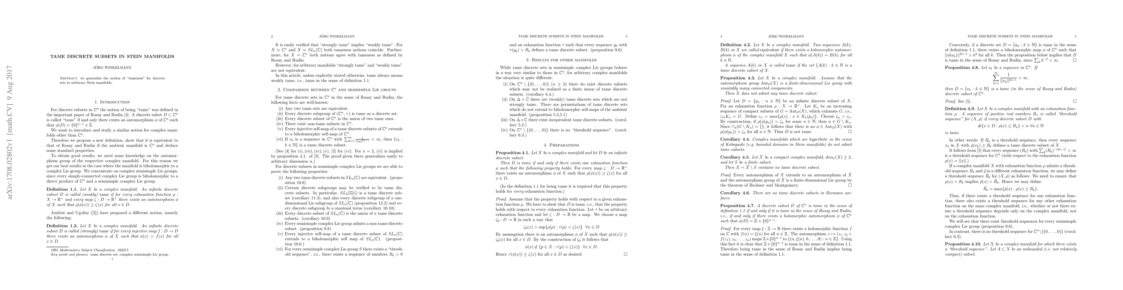 This paper generalizes the concept of "tameness" for discrete subsets from ${\bf C}^n$ to arbitrary complex manifolds, demonstrating that many results previously valid for ${\bf C}^n$ can also apply to semisimple complex Lie groups, such as the extension of permutations of $SL(2,{\bf Z})$ to $SL(2,{\bf C})$.