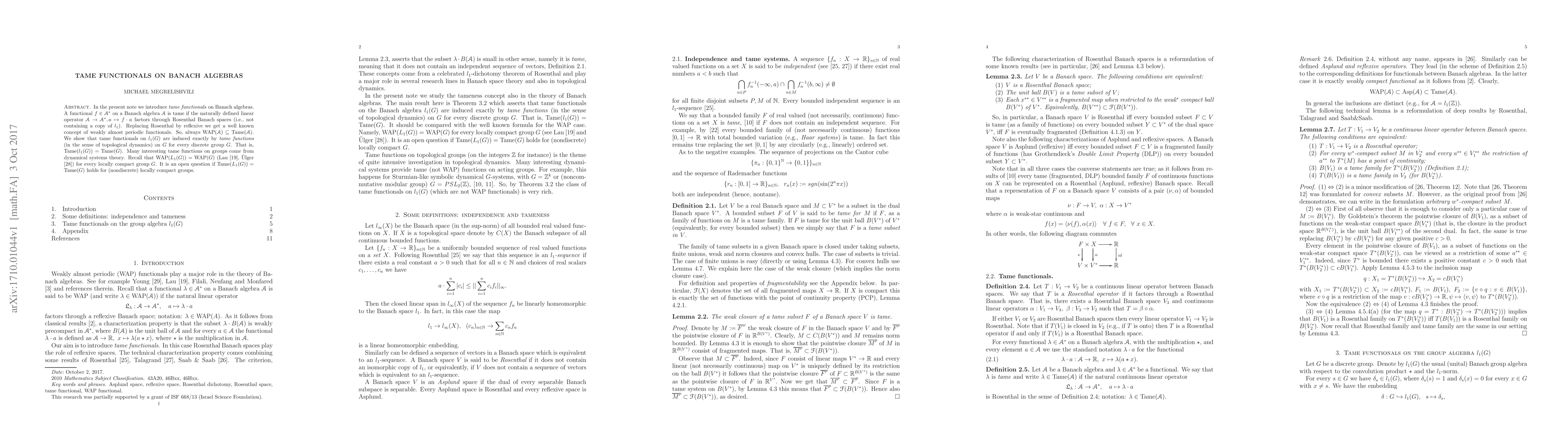 In the present note we introduce tame functionals on Banach algebras. A functional $f \in A^*$ on a Banach algebra $A$ is tame if the naturally defined linear operator $A \to A^*, a \mapsto f \cdot a$ factors through Rosenthal Banach spaces (i.e., not containing a copy of $l_1$). Replacing Rosenthal by reflexive we get a well known concept of weakly almost periodic functionals. So, always $WAP(A) \subseteq Tame(A)$. We show that tame functionals on the group algebra $l_1(G)$ are induced exactly by tame functions (in the sense of topological dynamics) on $G$ for every discrete group $G$. That is, $Tame(l_1(G))=Tame(G)$. Many interesting tame functions on groups come from dynamical systems theory. Recall that $WAP(L_1(G))=WAP(G)$ (Lau 1977, \"{U}lger 1986) for every locally compact group $G$. It is an open question if $Tame(L_1(G))=Tame(G)$ holds for (nondiscrete) locally compact groups.