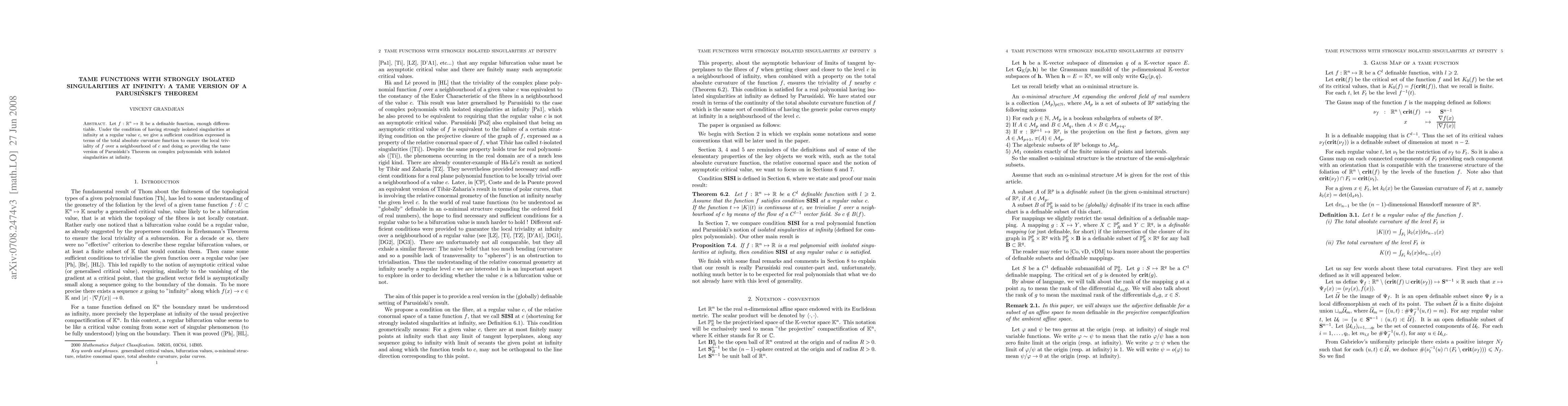 Let f be a definable function, enough differentiable. Under the condition of having strongly isolated singularities at infinity at a regular value c we give a sufficient condition expressed in terms of the total absolute curvature function to ensure the local triviality of the function f over a neighbourhood of c and doing so providing the tame version of Parusinski's Theorem on complex polynomials with isolated singularities at infinity.