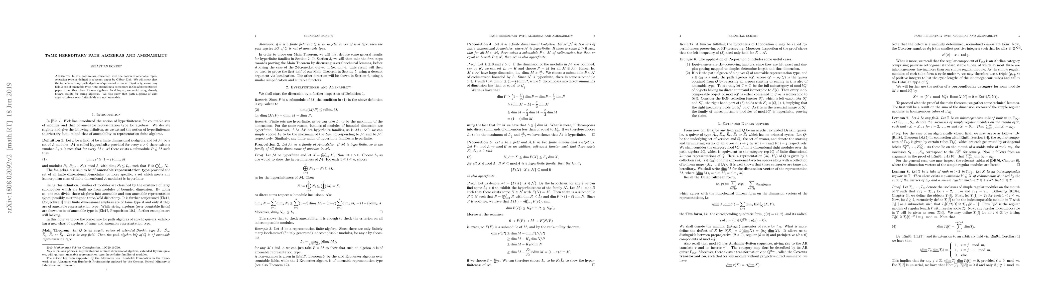 In this note we are concerned with the notion of amenable representation type as defined in a recent paper by G\'abor Elek. Roughly speaking, an algebra is of amenable type if for all $\varepsilon > 0$, every finite-dimensional module has a submodule which is a direct sum of modules which are small with respect to $\varepsilon$ such that the quotient is also small in that respect. We will show that the tame hereditary path algebras of quivers of extended Dynkin type over any field $k$ are of amenable type, thus extending a conjecture in the aforementioned paper to another class of tame algebras. In doing so, we avoid using already known results for string algebras. We also show that path algebras of wild acyclic quivers over finite fields are not amenable.
