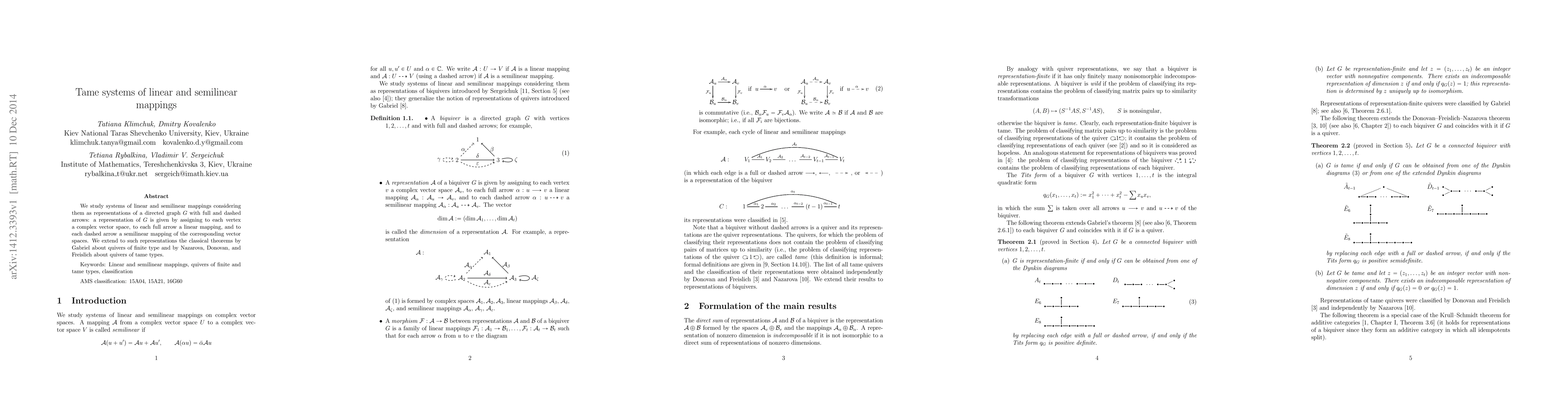 This research paper studies systems of linear and semilinear mappings as representations of a directed graph, extending classical theorems on quivers of finite type and tame types to such mappings.