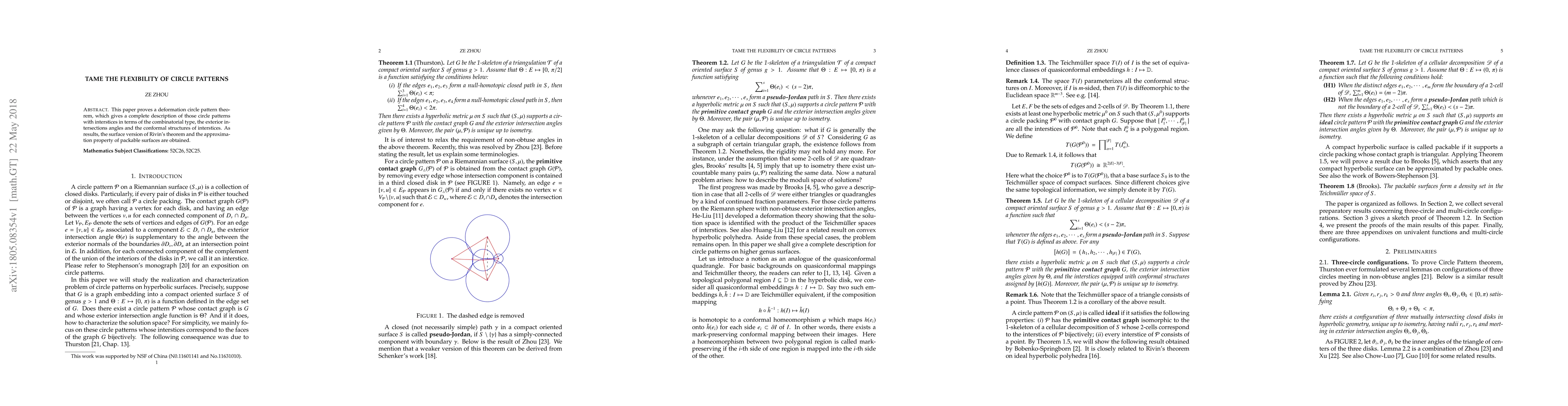 This paper proves a deformation circle pattern theorem, which gives a complete description of those circle patterns with interstices in terms of the combinatorial type, the exterior intersections angles and the conformal structures of interstices. As results, the surface version of Rivin's theorem and the approximation property of packable surfaces are obtained.