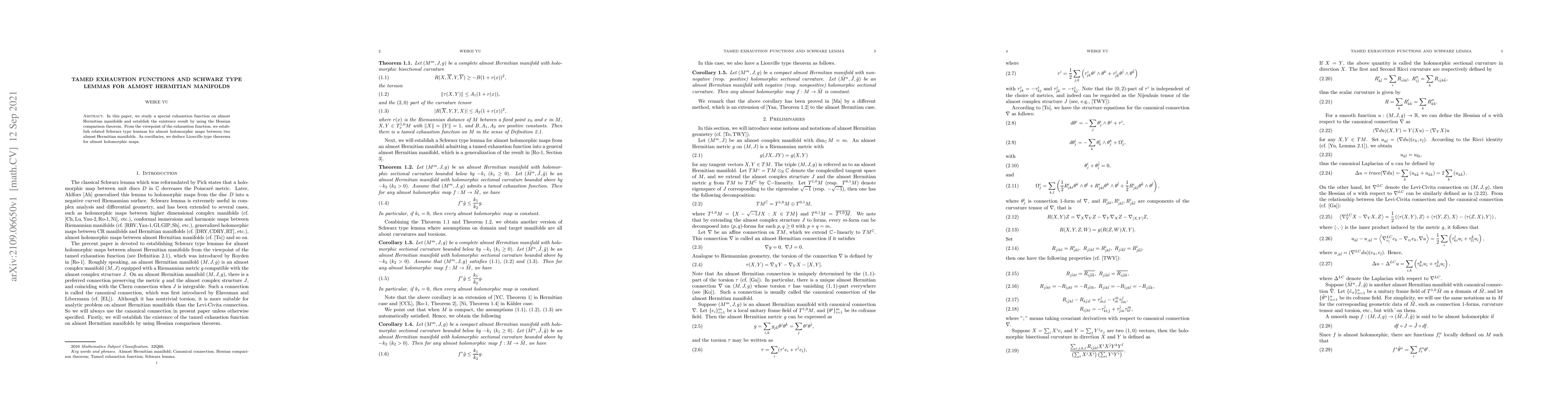 This paper investigates an exhaustion function on almost Hermitian manifolds, proving its existence via the Hessian comparison theorem. It also derives Schwarz type lemmas and Liouville theorems for almost holomorphic maps between such manifolds.