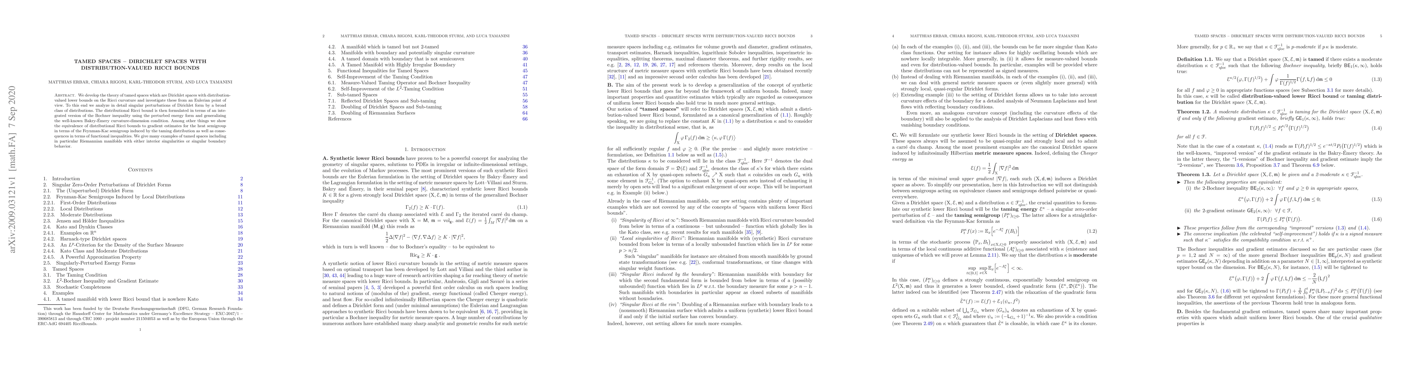 We develop the theory of tamed spaces which are Dirichlet spaces with distribution-valued lower bounds on the Ricci curvature and investigate these from an Eulerian point of view. To this end we analyze in detail singular perturbations of Dirichlet form by a broad class of distributions. The distributional Ricci bound is then formulated in terms of an integrated version of the Bochner inequality using the perturbed energy form and generalizing the well-known Bakry-\'Emery curvature-dimension condition. Among other things we show the equivalence of distributional Ricci bounds to gradient estimates for the heat semigroup in terms of the Feynman-Kac semigroup induced by the taming distribution as well as consequences in terms of functional inequalities. We give many examples of tamed spaces including in particular Riemannian manifolds with either interior singularities or singular boundary behavior.