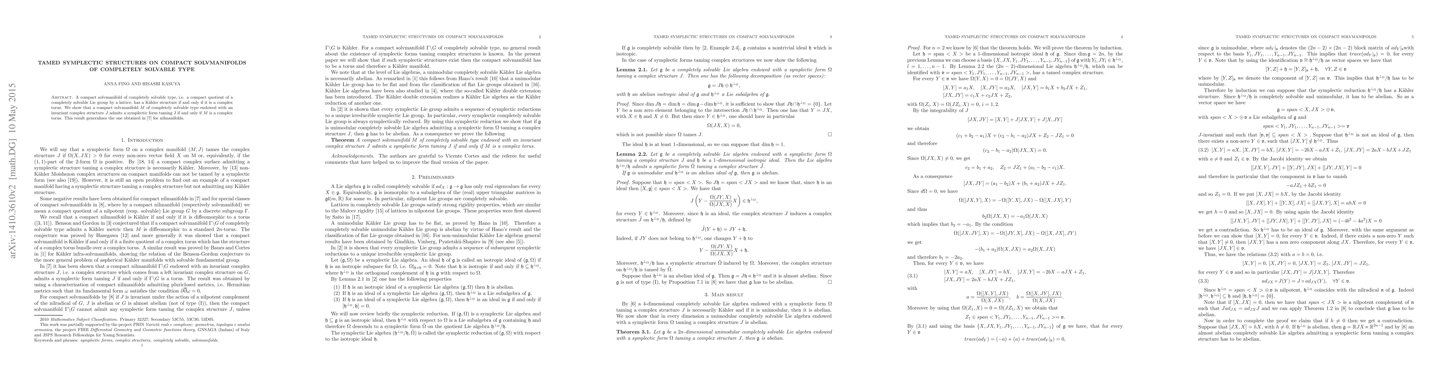 A compact solvmanifold of completely solvable type, i.e. a compact quotient of a completely solvable Lie group by a lattice, has a K\"ahler structure if and only if it is a complex torus. We show more in general that a compact solvmanifold $M$ of completely solvable type endowed with an invariant complex structure $J$ admits a symplectic form taming J if and only if $M$ is a complex torus. This result generalizes the one obtained in [7] for nilmanifolds.