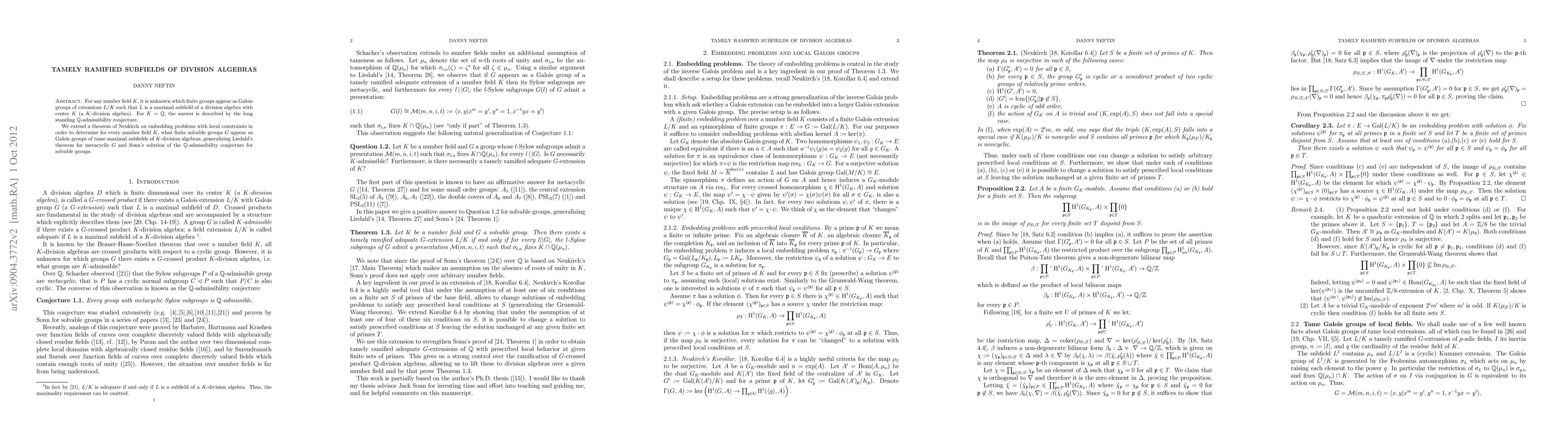 This paper extends Neukirch's theorem on embedding problems to determine which finite solvable groups can be Galois groups of tame maximal subfields of division algebras over any number field K. It generalizes previous results by Liedahl and Sonn, particularly addressing the Q-admissibility conjecture for solvable groups.