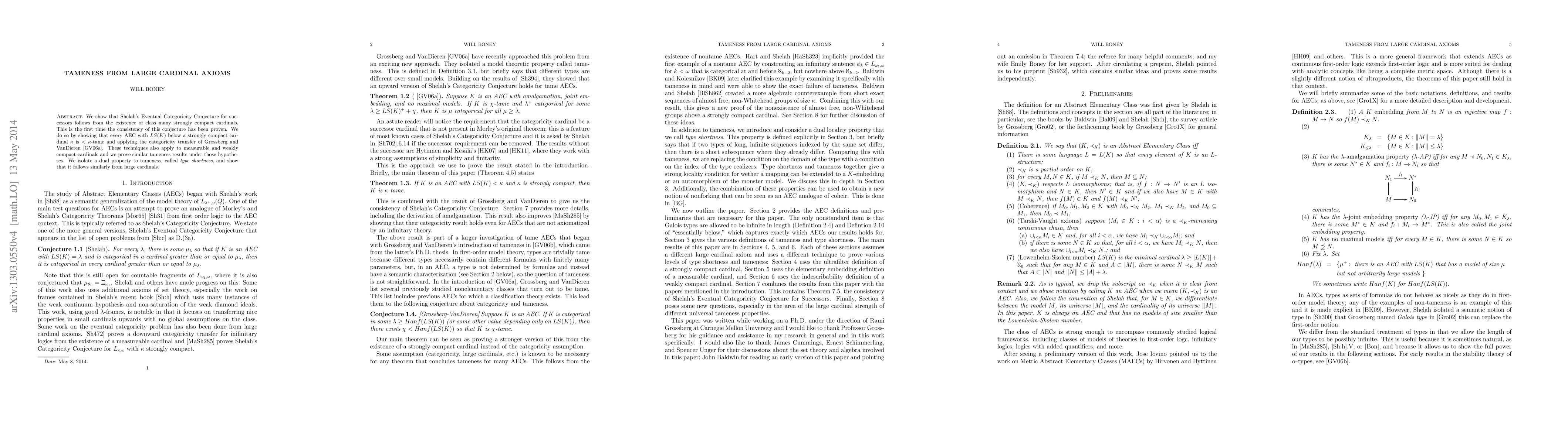 This paper proves Shelah's Eventual Categoricity Conjecture by demonstrating that the existence of class many strongly compact cardinals ensures tameness for every AEC with $LS(K)$ below $\kappa$. It also extends these techniques to measurable and weakly compact cardinals, establishing similar tameness results and introducing a new concept called type shortness.