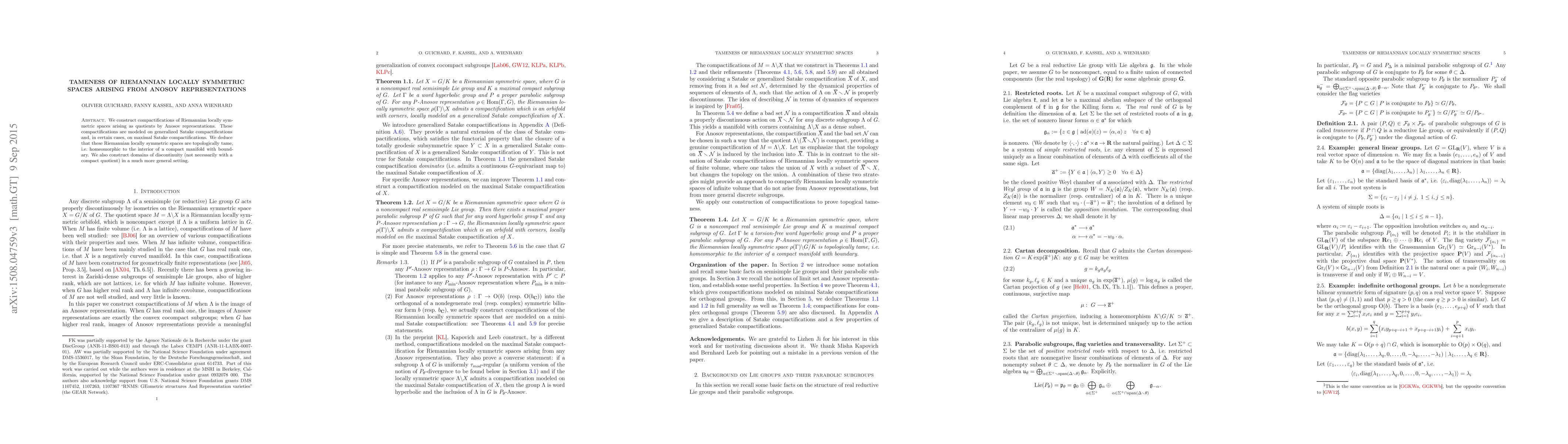 This paper constructs compactifications for Riemannian locally symmetric spaces derived from Anosov representations, proving their topological tameness and constructing domains of discontinuity in a broader context. The compactifications are modeled on generalized and maximal Satake compactifications.