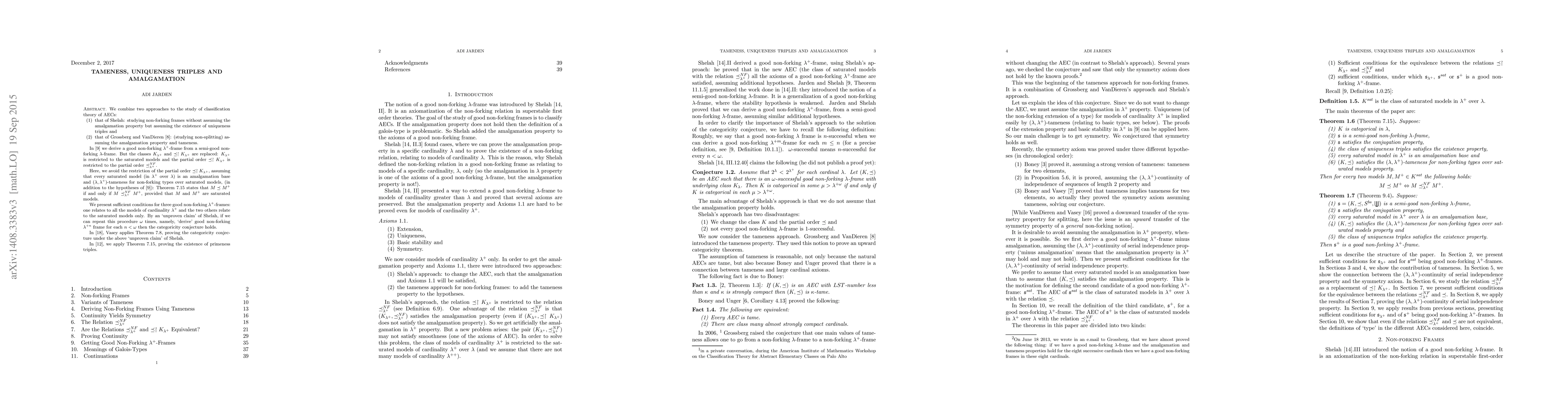 We combine two approaches to the study of classification theory of AECs: 1. that of Shelah: studying non-forking frames without assuming the amalgamation property but assuming the existence of uniqueness triples and 2. that of Grossberg and VanDieren: (studying non-splitting) assuming the amalgamation property and tameness. In [JrSh875], we derive a good non-forking $\lambda^+$-frame from a semi-good non-forking $\lambda$-frame. But the classes $K_{\lambda^+}$ and $\preceq \restriction K_{\lambda^+}$ are replaced: $K_{\lambda^+}$ is restricted to the saturated models and the partial order $\preceq \restriction K_{\lambda^+}$ is restricted to the partial order $\preceq^{NF}_{\lambda^+}$. Here, we avoid the restriction of the partial order $\preceq \restriction K_{\lambda^+}$, assuming that every saturated model (in $\lambda^+$ over $\lambda$) is an amalgamation base and $(\lambda,\lambda^+)$-tameness for non-forking types over saturated models, (in addition to the hypotheses of [JrSh875]): We prove that $M \preceq M^+$ if and only if $M \preceq^{NF}_{\lambda^+}M^+$, provided that $M$ and $M^+$ are saturated models. We present sufficient conditions for three good non-forking $\lambda^+$-frames: one relates to all the models of cardinality $\lambda^+$ and the two others relate to the saturated models only. By an `unproven claim' of Shelah, if we can repeat this procedure $\omega$ times, namely, `derive' good non-forking $\lambda^{+n}$ frame for each $n<\omega$ then the categoricity conjecture holds. Vasey applies one of our main theorems in a proof of the categoricity conjecture under the above `unproven claim' of Shelah and more assumptions. In [Jrprime], we apply the main theorem in a proof of the existence of primeness triples.