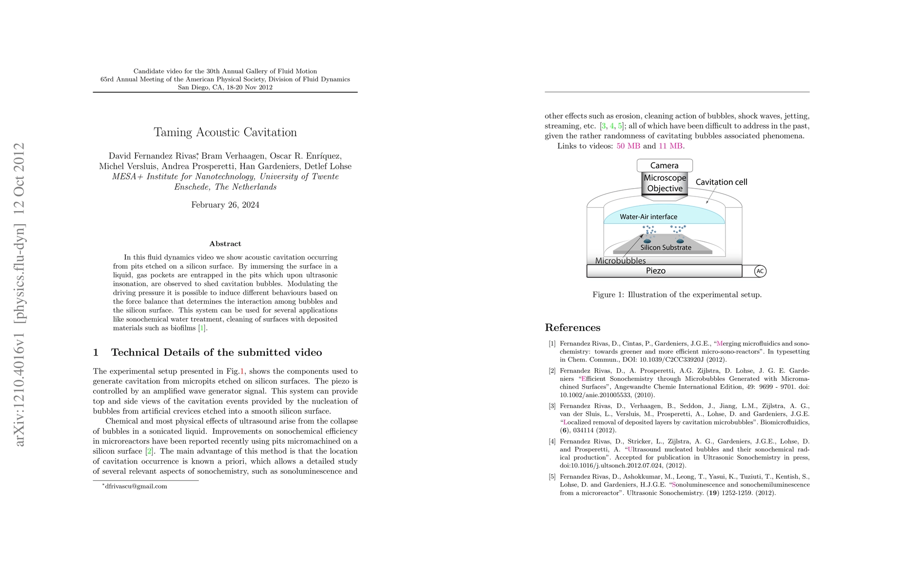 This study demonstrates acoustic cavitation in pits etched on a silicon surface, where gas pockets form bubbles under ultrasonic insonation. By adjusting the driving pressure, different bubble behaviors and interactions with the surface are observed, with potential applications in sonochemical water treatment and surface cleaning.