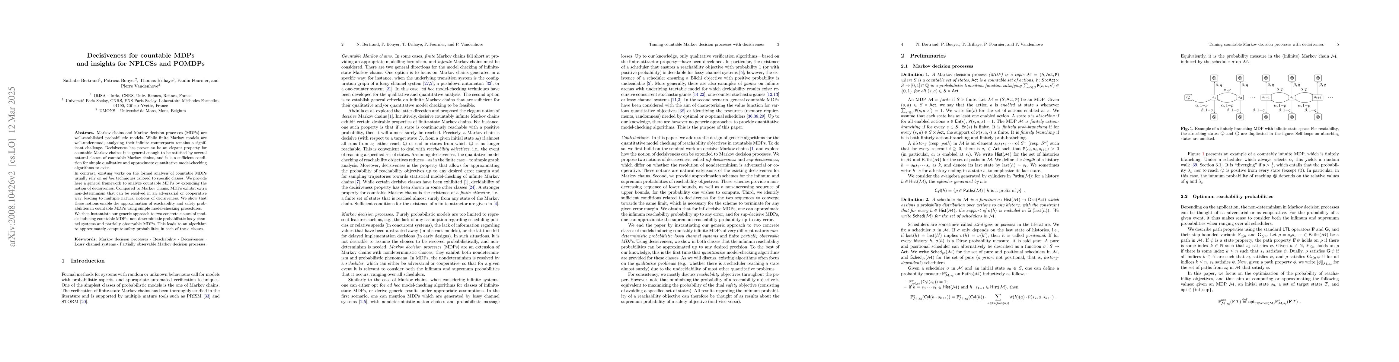 This paper extends the concept of decisiveness from denumerable Markov chains to Markov decision processes, introducing two notions of decisiveness to handle the additional non-determinism. It investigates whether these notions enable model checking procedures for the infimum and supremum probabilities of reachability properties.