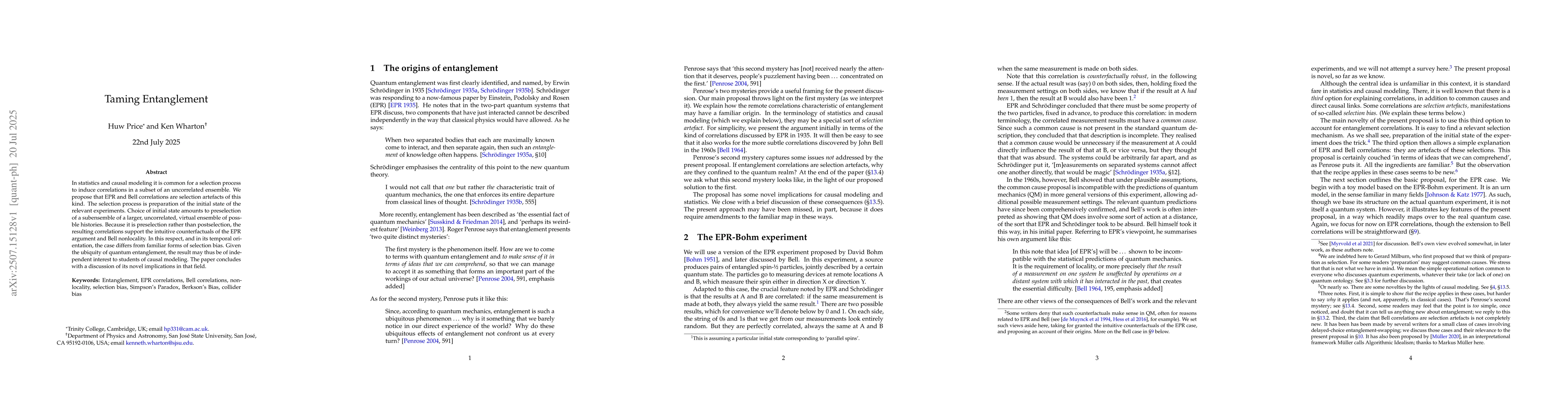 In statistics and causal modeling it is common for a selection process to induce correlations in a subset of an uncorrelated ensemble. We propose that EPR and Bell correlations are selection artefacts of this kind. The selection process is preparation of the initial state of the relevant experiments. Choice of initial state amounts to preselection of a subensemble of a larger, uncorrelated, virtual ensemble of possble histories. Because it is preselection rather than postselection, the resulting correlations support the intuitive counterfactuals of the EPR argument and Bell nonlocality. In this respect, and in its temporal orientation, the case differs from familiar forms of selection bias. Given the ubiquity of quantum entanglement, the result may thus be of independent interest to students of causal modeling. The paper concludes with a discussion of its novel implications in that field.
