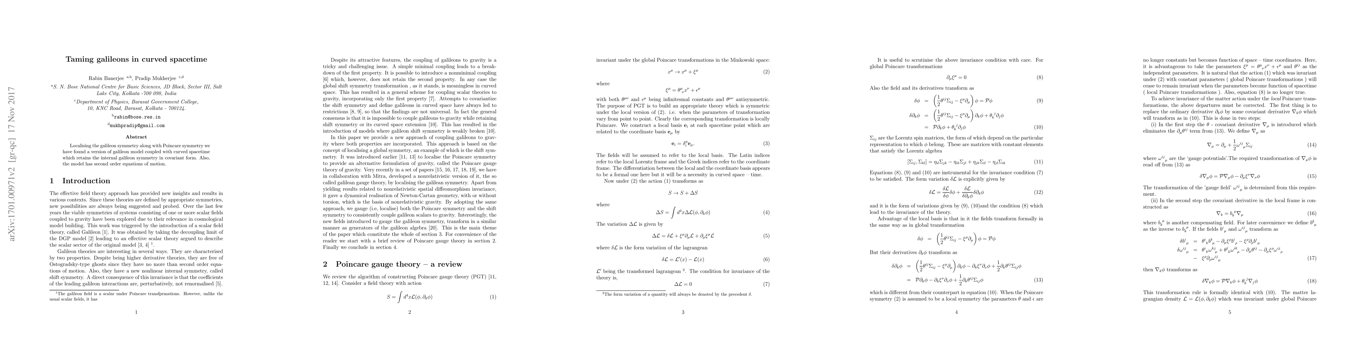 Localising the galileon symmetry along with Poincare symmetry we have found a version of galileon model coupled with curved spacetime which retains the internal galileon symmetry in covariant form. Also, the model has second order equations of motion.
