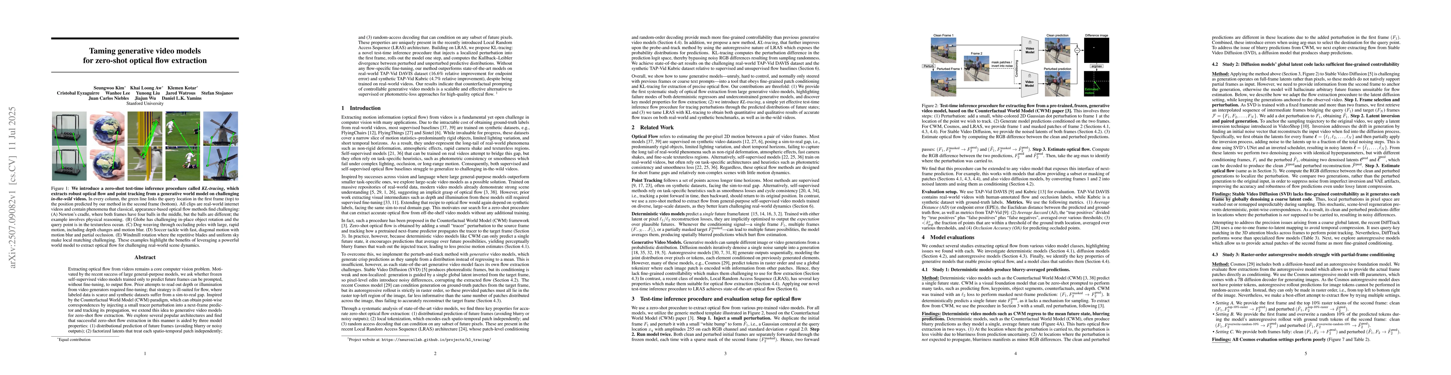 Extracting optical flow from videos remains a core computer vision problem. Motivated by the success of large general-purpose models, we ask whether frozen self-supervised video models trained only for future frame prediction can be prompted, without fine-tuning, to output flow. Prior work reading out depth or illumination from video generators required fine-tuning, which is impractical for flow where labels are scarce and synthetic datasets suffer from a sim-to-real gap. Inspired by the Counterfactual World Model (CWM) paradigm, which can obtain point-wise correspondences by injecting a small tracer perturbation into a next-frame predictor and tracking its propagation, we extend this idea to generative video models. We explore several popular architectures and find that successful zero-shot flow extraction in this manner is aided by three model properties: (1) distributional prediction of future frames (avoiding blurry or noisy outputs); (2) factorized latents that treat each spatio-temporal patch independently; and (3) random-access decoding that can condition on any subset of future pixels. These properties are uniquely present in the recent Local Random Access Sequence (LRAS) architecture. Building on LRAS, we propose KL-tracing: a novel test-time procedure that injects a localized perturbation into the first frame, rolls out the model one step, and computes the Kullback-Leibler divergence between perturbed and unperturbed predictive distributions. Without any flow-specific fine-tuning, our method outperforms state-of-the-art models on real-world TAP-Vid DAVIS dataset (16.6% relative improvement for endpoint error) and synthetic TAP-Vid Kubric (4.7% relative improvement). Our results indicate that counterfactual prompting of controllable generative video models is a scalable and effective alternative to supervised or photometric-loss approaches for high-quality flow.
