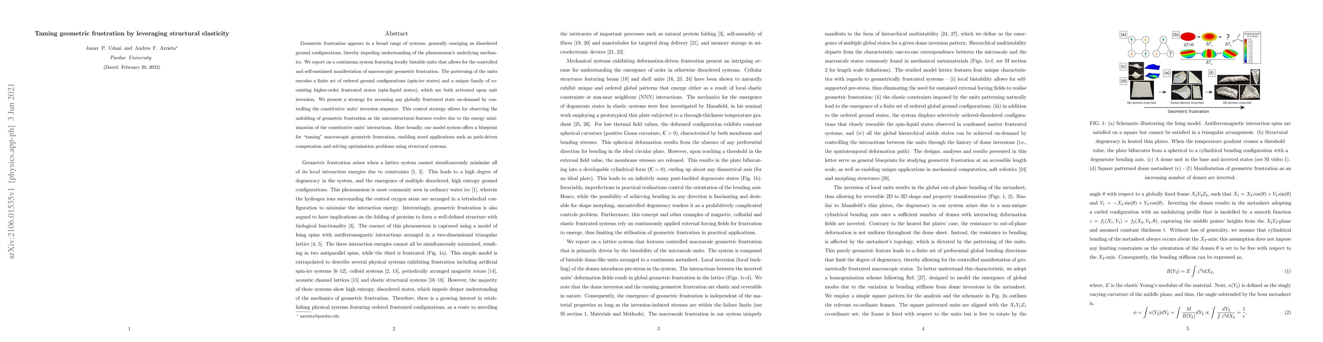 Geometric frustration appears in a broad range of systems, generally emerging as disordered ground configurations, thereby impeding understanding of the phenomenon's underlying mechanics. We report on a continuum system featuring locally bistable units that allows for the controlled and self-sustained manifestation of macroscopic geometric frustration. The patterning of the units encodes a finite set of ordered ground configurations (spin-ice states) and a unique family of co-existing higher-order frustrated states (spin-liquid states), which are both activated upon unit inversion. We present a strategy for accessing any globally frustrated state on-demand by controlling the constitutive units' inversion sequence. This control strategy allows for observing the unfolding of geometric frustration as the microstructural features evolve due to the energy minimization of the constitutive units' interactions. More broadly, our model system offers a blueprint for "taming" macroscopic geometric frustration, enabling novel applications such as path-driven computation and solving optimisation problems using structural systems.