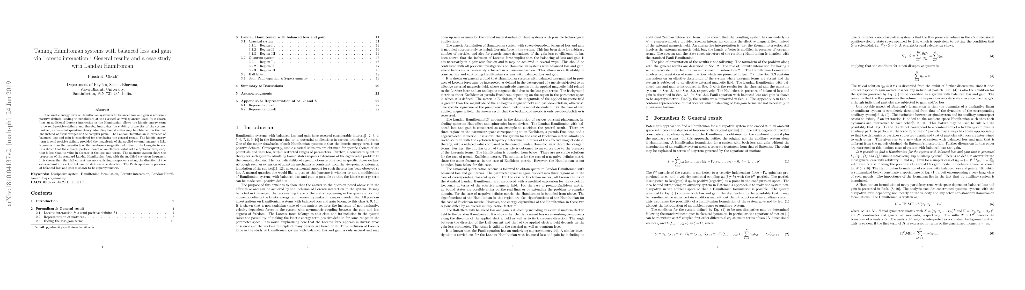 This paper demonstrates that introducing Lorentz interaction into Hamiltonian systems with balanced loss and gain can stabilize them by making the kinetic energy term semi-positive-definite. A case study using the Landau Hamiltonian reveals that the classical and quantum systems exhibit modified cyclotron frequencies and a non-vanishing Hall current, with the Pauli equation shown to be supersymmetric.