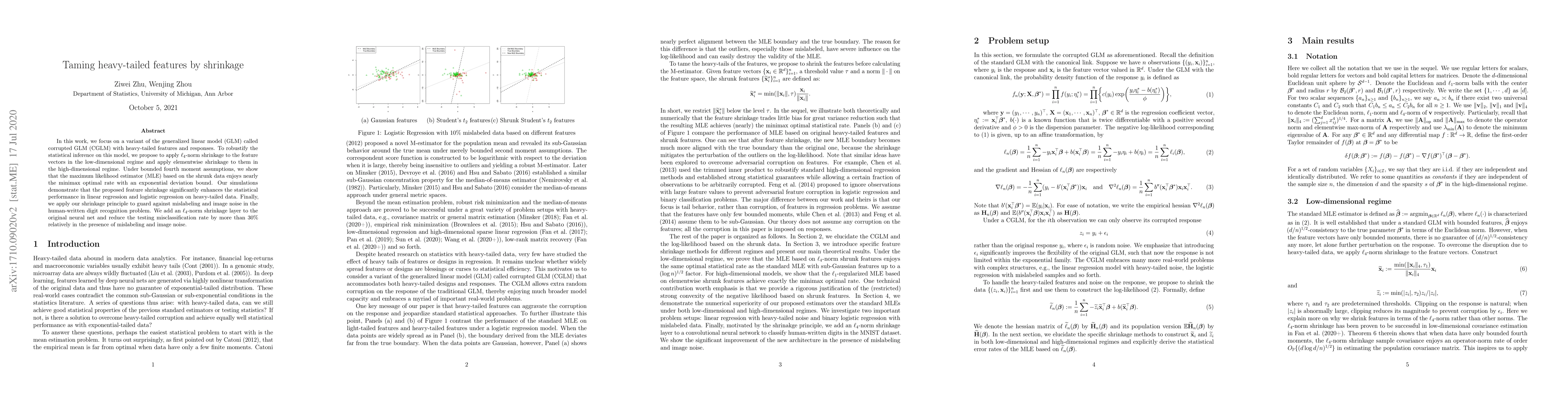 In this work, we focus on a variant of the generalized linear model (GLM) called corrupted GLM (CGLM) with heavy-tailed features and responses. To robustify the statistical inference on this model, we propose to apply $\ell_4$-norm shrinkage to the feature vectors in the low-dimensional regime and apply elementwise shrinkage to them in the high-dimensional regime. Under bounded fourth moment assumptions, we show that the maximum likelihood estimator (MLE) based on the shrunk data enjoys nearly the minimax optimal rate with an exponential deviation bound. Our simulations demonstrate that the proposed feature shrinkage significantly enhances the statistical performance in linear regression and logistic regression on heavy-tailed data. Finally, we apply our shrinkage principle to guard against mislabeling and image noise in the human-written digit recognition problem. We add an $\ell_4$-norm shrinkage layer to the original neural net and reduce the testing misclassification rate by more than $30\%$ relatively in the presence of mislabeling and image noise.