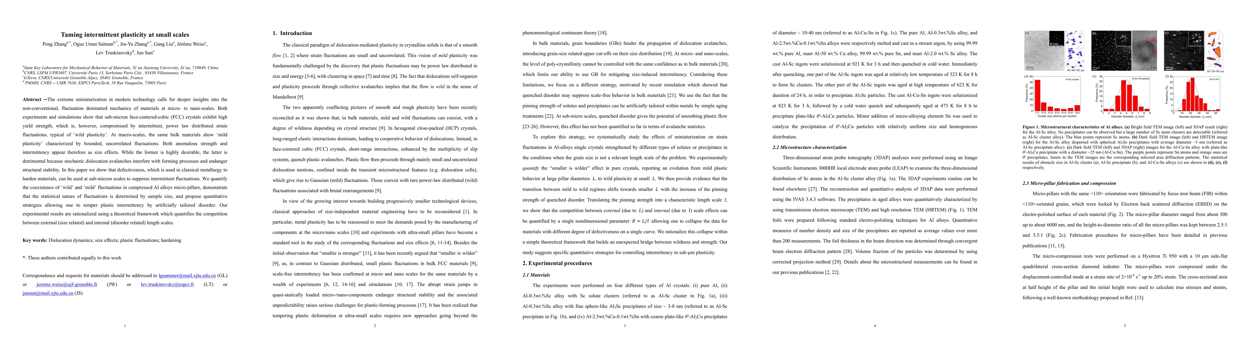 The extreme miniaturization in modern technology calls for deeper insights into the non-conventional, fluctuation dominated mechanics of materials at micro- to nano-scales. Both experiments and simulations show that sub-micron face-centered-cubic (FCC) crystals exhibit high yield strength, which is, however, compromised by intermittent, power law distributed strain fluctuations, typical of wild plasticity. At macro-scales, the same bulk materials show mild plasticity characterized by bounded, uncorrelated fluctuations. Both anomalous strength and intermittency appear therefore as size effects. While the former is highly desirable, the latter is detrimental because stochastic dislocation avalanches interfere with forming processes and endanger structural stability. In this paper we show that defectiveness, which is used in classical metallurgy to harden materials, can be used at sub-micron scales to suppress intermittent fluctuations. We quantify the coexistence of wild and mild fluctuations in compressed Al alloys micro-pillars, demonstrate that the statistical nature of fluctuations is determined by sample size, and propose quantitative strategies allowing one to temper plastic intermittency by artificially tailored disorder. Our experimental results are rationalized using a theoretical framework which quantifies the competition between external (size related) and internal (disorder related) length scales.