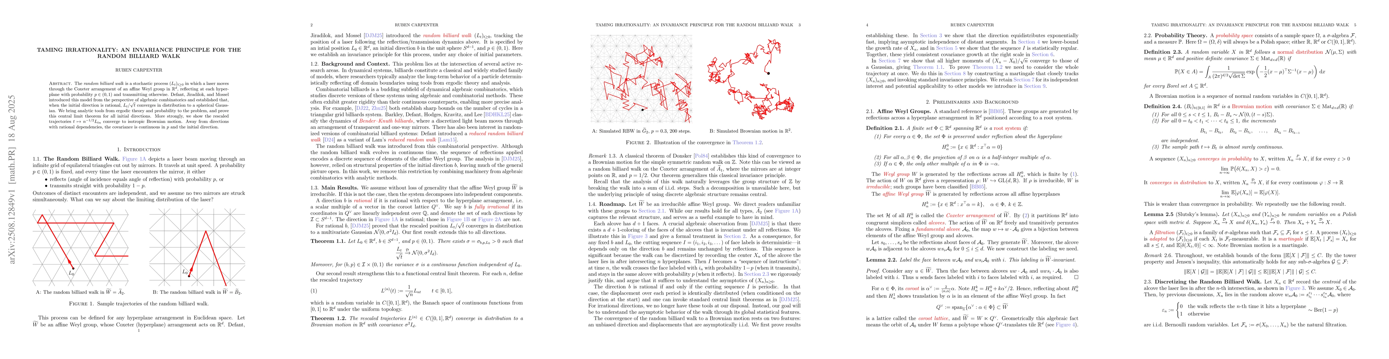 The random billiard walk is a stochastic process $(L_t)_{t\geq 0}$ in which a laser moves through the Coxeter arrangement of an affine Weyl group in $\mathbb{R}^d$, reflecting at each hyperplane with probability $p\in (0, 1)$ and transmitting unchanged otherwise. Defant, Jiradilok, and Mossel introduced this process from the perspective of algebraic combinatorics and established that, for initial directions aligned with the coroot lattice, $L_t/\sqrt{t}$ converges to a centered spherical Gaussian. We bring analytic tools from ergodic theory and probability to the problem and extend this central limit theorem to all initial directions. More strongly, we prove the rescaled trajectories $t\mapsto n^{-1/2}L_{tn}$ converge to isotropic Brownian motion. Away from directions with rational dependencies, the limiting covariance varies continuously in $p$ and the initial direction.