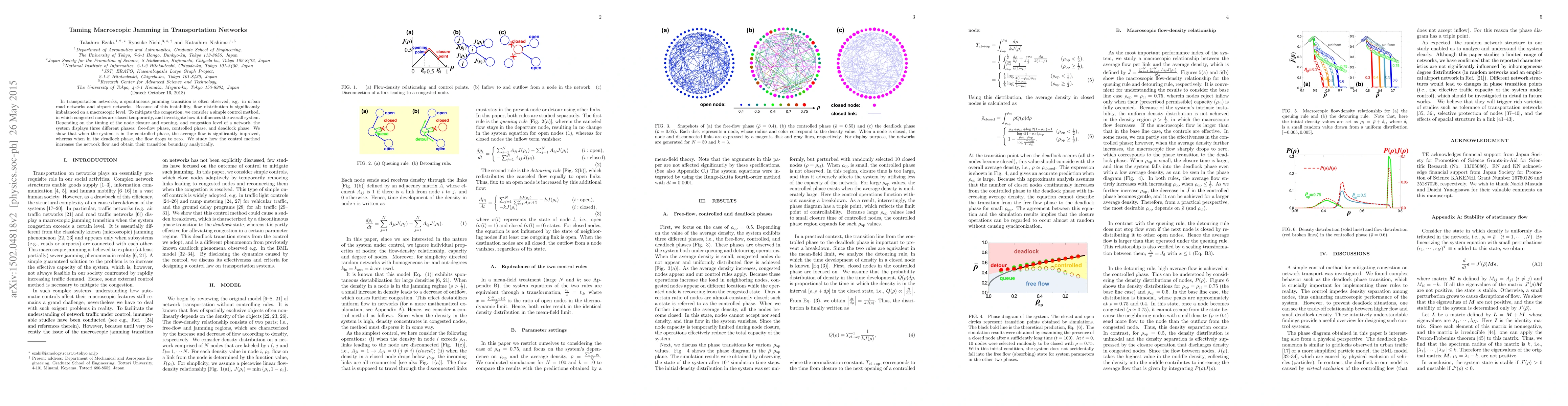 This paper investigates a control method to mitigate macroscopic jamming in transportation networks by temporarily closing congested nodes. The method leads to three phases: free-flow, controlled, and deadlock, with significant improvements in average flow during the controlled phase, and analytical determination of the transition boundary.