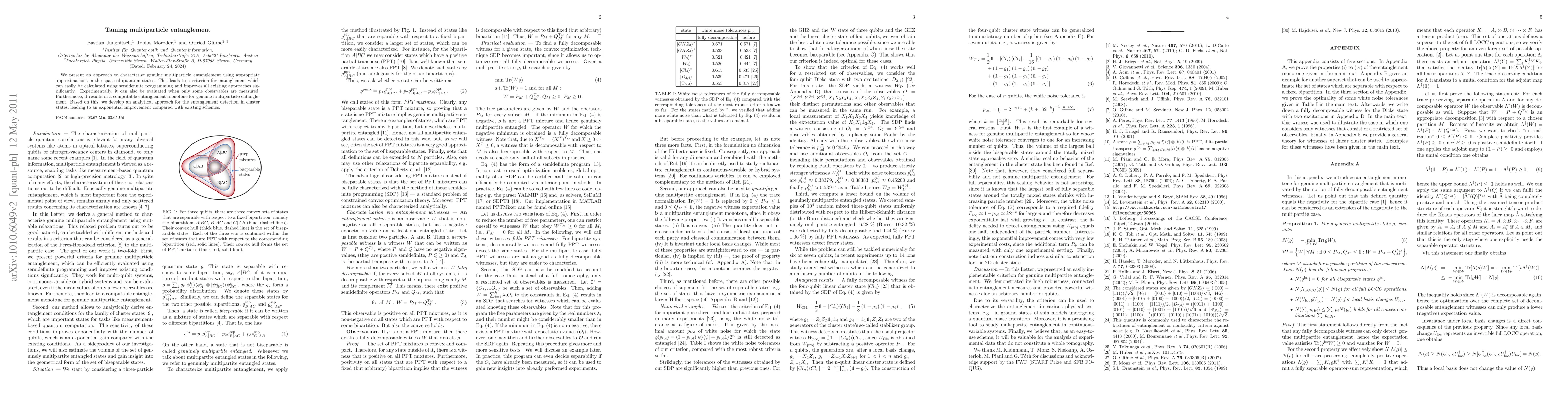 This paper introduces a new method for characterizing genuine multiparticle entanglement using semidefinite programming, which significantly improves existing criteria and allows for experimental evaluation with partial measurements. It also develops an analytical approach for detecting entanglement in cluster states with exponential improvement over current schemes.