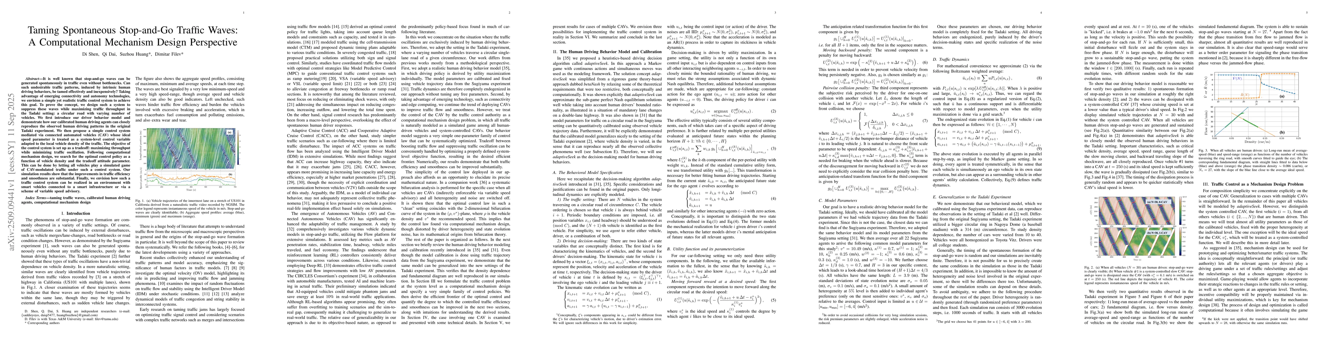 It is well known that stop-and-go waves can be generated spontaneously in traffic even without bottlenecks. Can such undesirable traffic patterns, induced by intrinsic human driving behaviors, be tamed effectively and inexpensively? Taking advantage of emerging connectivity and autonomy technologies, we envision a simple yet realistic traffic control system to achieve this goal. To prove the concept, we design such a system to suppress these waves while maximizing traffic throughput in the Tadaki setting: a circular road with varying number of vehicles. We first introduce our driver behavior model and demonstrate how our calibrated human driving agents can closely reproduce the observed human driving patterns in the original Tadaki experiment. We then propose a simple control system mediated via connected automated vehicles (CAV) whose ideal speed parameter is treated as a system-level control variable adapted to the local vehicle density of the traffic. The objective of the control system is set up as a tradeoff: maximizing throughput while minimizing traffic oscillation. Following computational mechanism design, we search for the optimal control policy as a function of vehicle density and the tradeoff attitude parameter. This can be done by letting all vehicles play a simulated game of CAV-modulated traffic under such a control system. Our simulation results show that the improvements in traffic efficiency and smoothness are substantial. Finally, we envision how such a traffic control system can be realized in an environment with smart vehicles connected to a smart infrastructure or via a scheme of variable speed advisory.