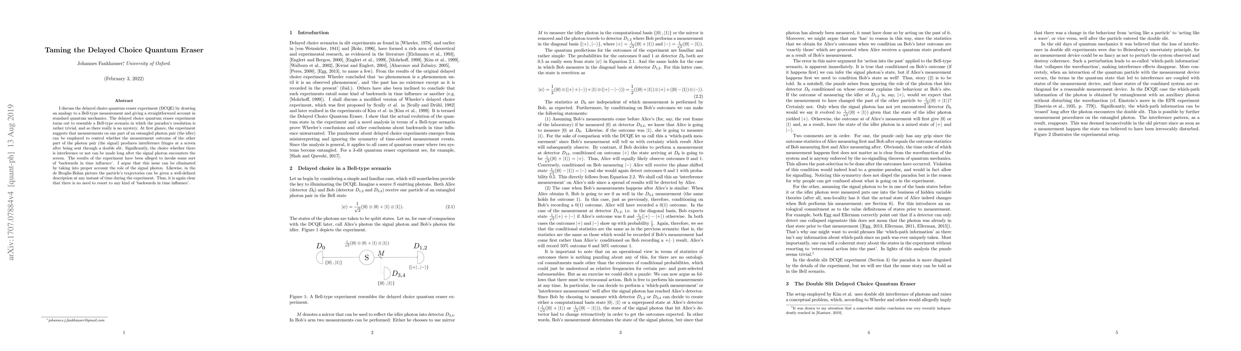 The delayed choice quantum eraser experiment appears to suggest a 'backwards in time influence', but a standard quantum mechanics analysis reveals that the choice of interference is determined by the signal photon, eliminating any paradox. The de Broglie-Bohm picture also provides a clear trajectory for the particle, negating the need for any non-local effects.