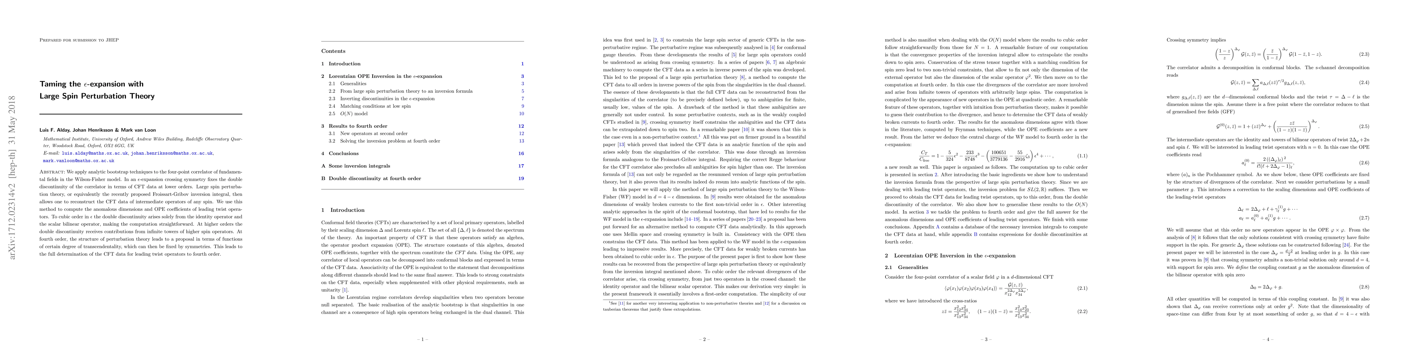 We apply analytic bootstrap techniques to the four-point correlator of fundamental fields in the Wilson-Fisher model. In an $\epsilon$-expansion crossing symmetry fixes the double discontinuity of the correlator in terms of CFT data at lower orders. Large spin perturbation theory, or equivalently the recently proposed Froissart-Gribov inversion integral, then allows one to reconstruct the CFT data of intermediate operators of any spin. We use this method to compute the anomalous dimensions and OPE coefficients of leading twist operators. To cubic order in $\epsilon$ the double discontinuity arises solely from the identity operator and the scalar bilinear operator, making the computation straightforward. At higher orders the double discontinuity receives contributions from infinite towers of higher spin operators. At fourth order, the structure of perturbation theory leads to a proposal in terms of functions of certain degree of transcendentality, which can then be fixed by symmetries. This leads to the full determination of the CFT data for leading twist operators to fourth order.