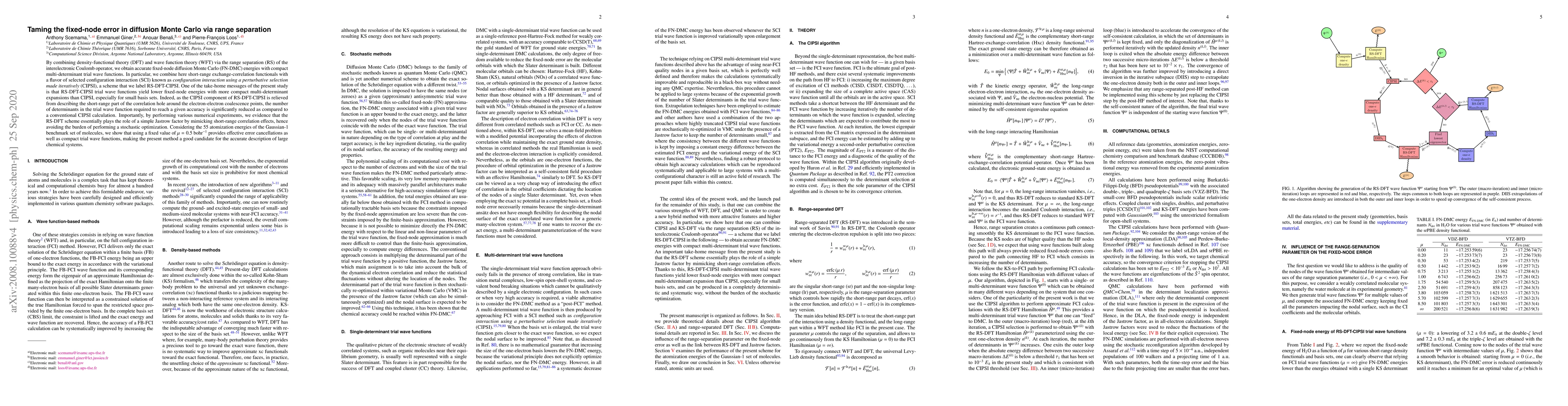 This paper proposes a method combining range-separated density-functional theory (DFT) and configuration interaction (CIPSI) to achieve accurate fixed-node diffusion Monte Carlo (FN-DMC) energies with compact multi-determinant trial wave functions, demonstrating effective error cancellation and reduced computational cost for large chemical systems.