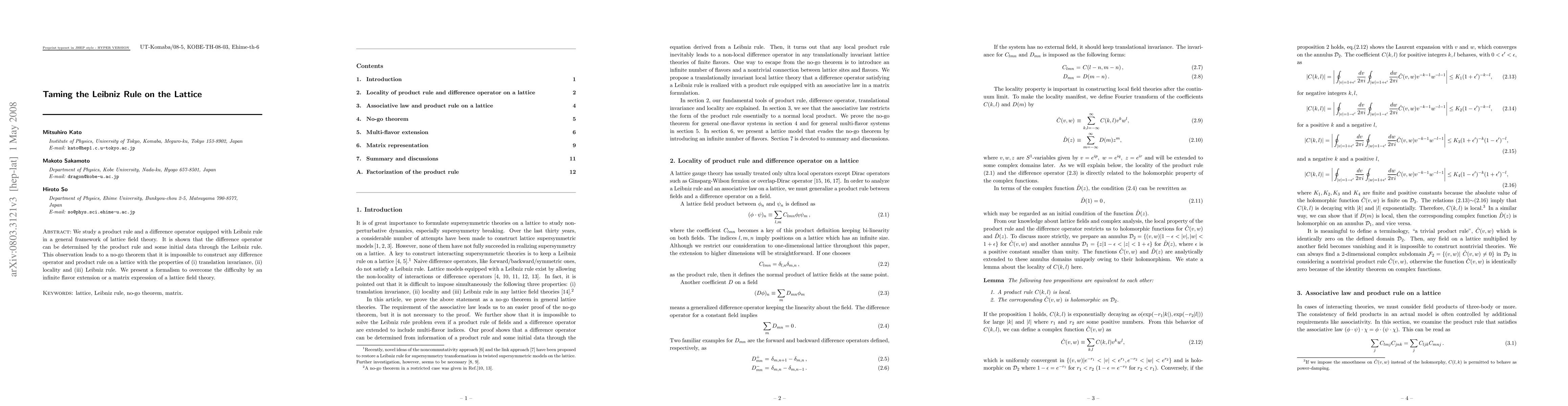 This paper explores the Leibniz rule in lattice field theory, demonstrating that constructing a difference operator and product rule with translation invariance, locality, and the Leibniz rule is impossible. It proposes an infinite flavor extension or matrix formalism as a solution to overcome this limitation.