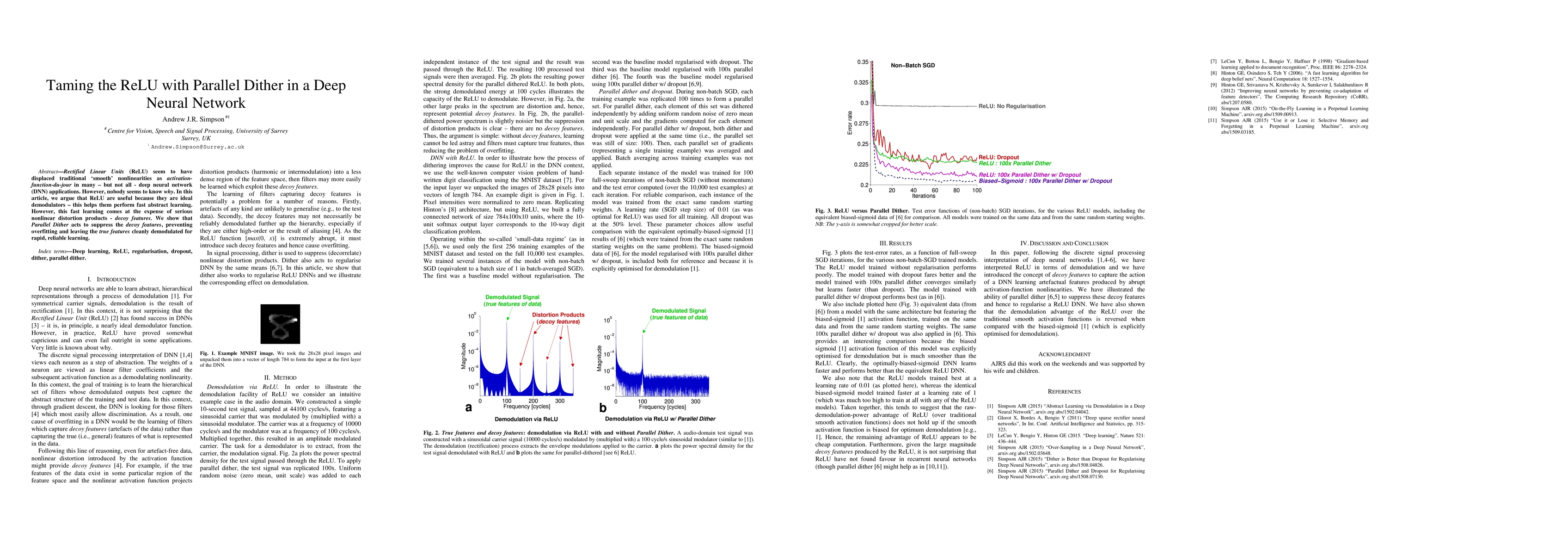 Rectified Linear Units (ReLU) seem to have displaced traditional 'smooth' nonlinearities as activation-function-du-jour in many - but not all - deep neural network (DNN) applications. However, nobody seems to know why. In this article, we argue that ReLU are useful because they are ideal demodulators - this helps them perform fast abstract learning. However, this fast learning comes at the expense of serious nonlinear distortion products - decoy features. We show that Parallel Dither acts to suppress the decoy features, preventing overfitting and leaving the true features cleanly demodulated for rapid, reliable learning.
