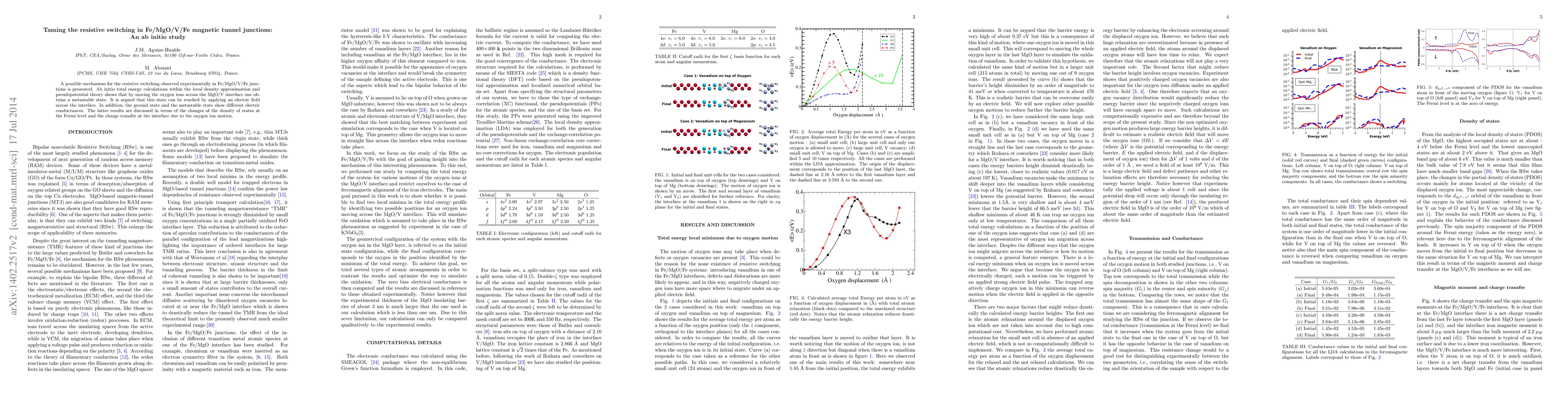 Researchers used ab initio calculations to propose a mechanism for resistive switching in Fe/MgO/V/Fe magnetic tunnel junctions, involving oxygen ion movement that can be triggered by an electric field.