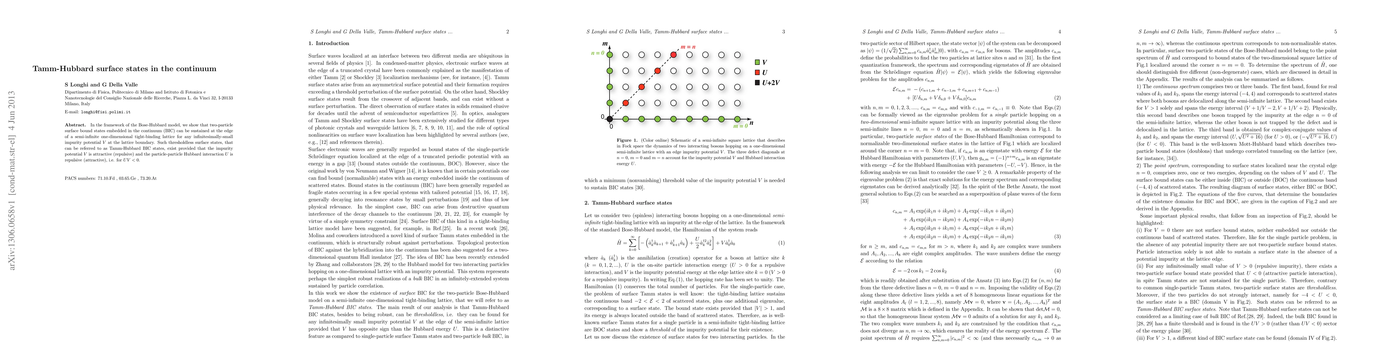 Two-particle surface bound states in the continuum (BIC) exist at the edge of a semi-infinite one-dimensional tight-binding lattice in the Bose-Hubbard model, provided the boundary impurity potential is attractive and the particle-particle interaction is of opposite sign. These Tamm-Hubbard BIC states are thresholdless.