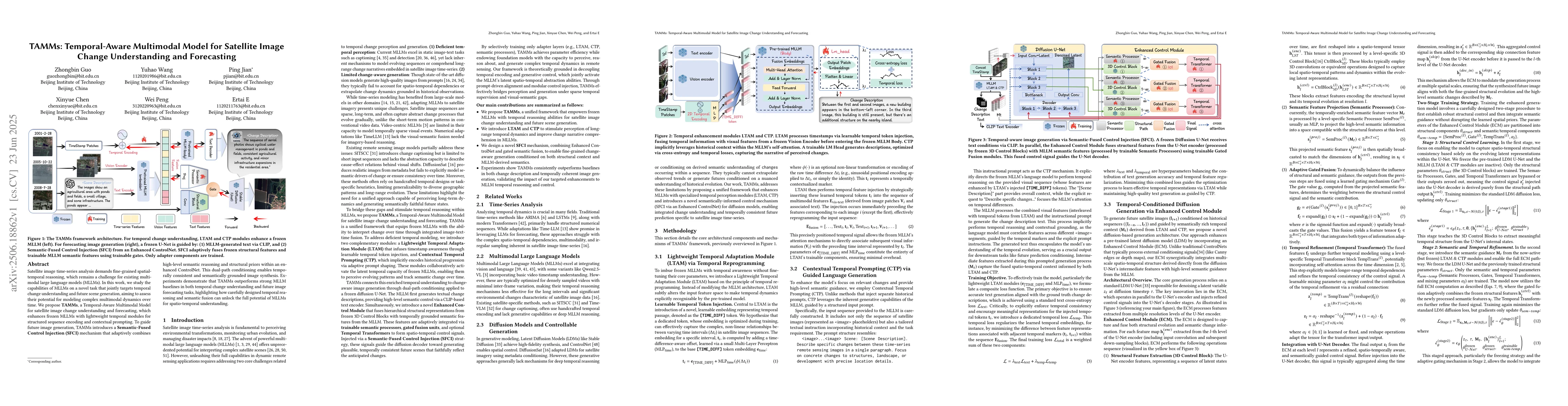 Satellite image time-series analysis demands fine-grained spatial-temporal reasoning, which remains a challenge for existing multimodal large language models (MLLMs). In this work, we study the capabilities of MLLMs on a novel task that jointly targets temporal change understanding and future scene generation, aiming to assess their potential for modeling complex multimodal dynamics over time. We propose TAMMs, a Temporal-Aware Multimodal Model for satellite image change understanding and forecasting, which enhances frozen MLLMs with lightweight temporal modules for structured sequence encoding and contextual prompting. To guide future image generation, TAMMs introduces a Semantic-Fused Control Injection (SFCI) mechanism that adaptively combines high-level semantic reasoning and structural priors within an enhanced ControlNet. This dual-path conditioning enables temporally consistent and semantically grounded image synthesis. Experiments demonstrate that TAMMs outperforms strong MLLM baselines in both temporal change understanding and future image forecasting tasks, highlighting how carefully designed temporal reasoning and semantic fusion can unlock the full potential of MLLMs for spatio-temporal understanding.