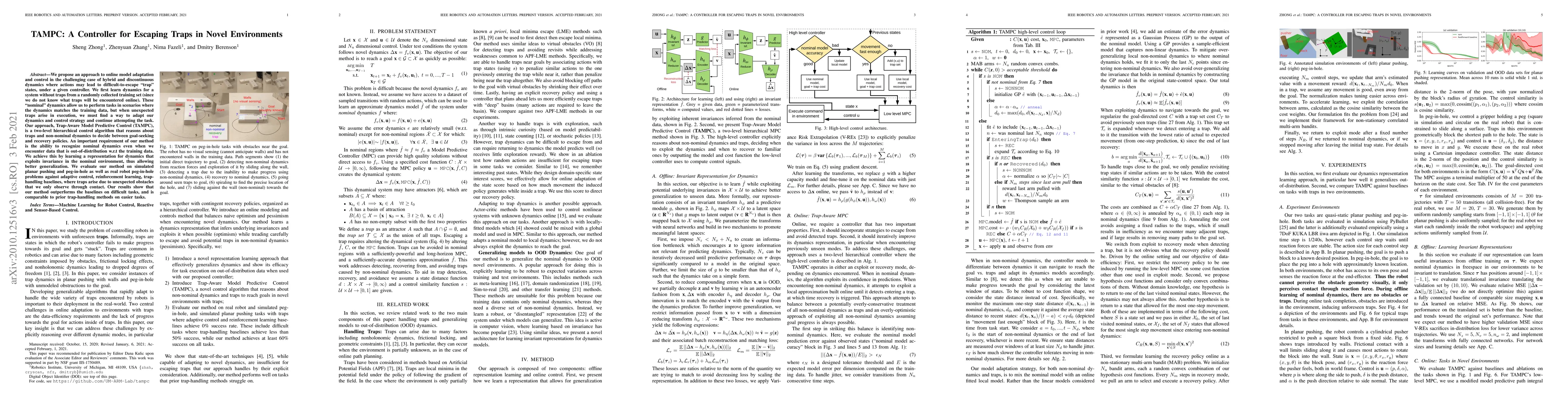 We propose an approach to online model adaptation and control in the challenging case of hybrid and discontinuous dynamics where actions may lead to difficult-to-escape "trap" states, under a given controller. We first learn dynamics for a system without traps from a randomly collected training set (since we do not know what traps will be encountered online). These "nominal" dynamics allow us to perform tasks in scenarios where the dynamics matches the training data, but when unexpected traps arise in execution, we must find a way to adapt our dynamics and control strategy and continue attempting the task. Our approach, Trap-Aware Model Predictive Control (TAMPC), is a two-level hierarchical control algorithm that reasons about traps and non-nominal dynamics to decide between goal-seeking and recovery policies. An important requirement of our method is the ability to recognize nominal dynamics even when we encounter data that is out-of-distribution w.r.t the training data. We achieve this by learning a representation for dynamics that exploits invariance in the nominal environment, thus allowing better generalization. We evaluate our method on simulated planar pushing and peg-in-hole as well as real robot peg-in-hole problems against adaptive control, reinforcement learning, trap-handling baselines, where traps arise due to unexpected obstacles that we only observe through contact. Our results show that our method outperforms the baselines on difficult tasks, and is comparable to prior trap-handling methods on easier tasks.