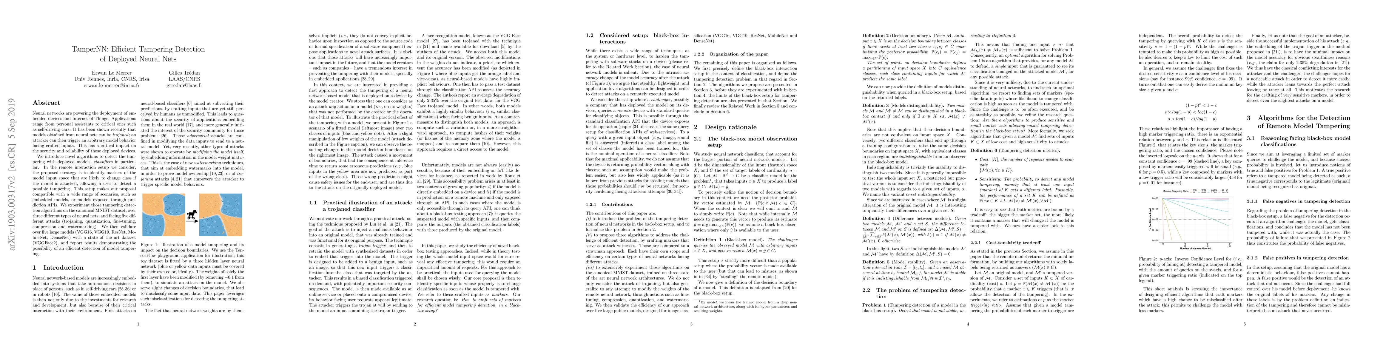 This research introduces TamperNN, a method to detect tampering in deployed neural networks, allowing users to identify possible attacks on devices like self-driving cars or personal assistants. The proposed strategy is effective in detecting model tampering using various attack types and models.